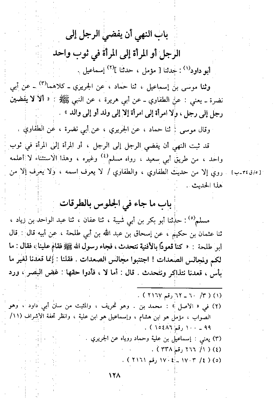 وثنا مُوسَى بن إِسْمَاعِيل، ثَنَا حَمَّاد، عَن الْجريرِي - كِلَاهُمَا - عَن أبي نَضرة - يَعْنِي: عَن الطفَاوِي - عَن أبي هُرَيْرَة، عَن النَّبِي - صَلَّى اللَّهُ عَلَيْهِ وَسَلَّم َ -: " أَلا لَا يفضين رجل إِلَى رجل، وَلَا امْرَأَة إِلَى امْرَأَة إِلَّا إِلَى ولد أَو إِلَى وَالِد ".