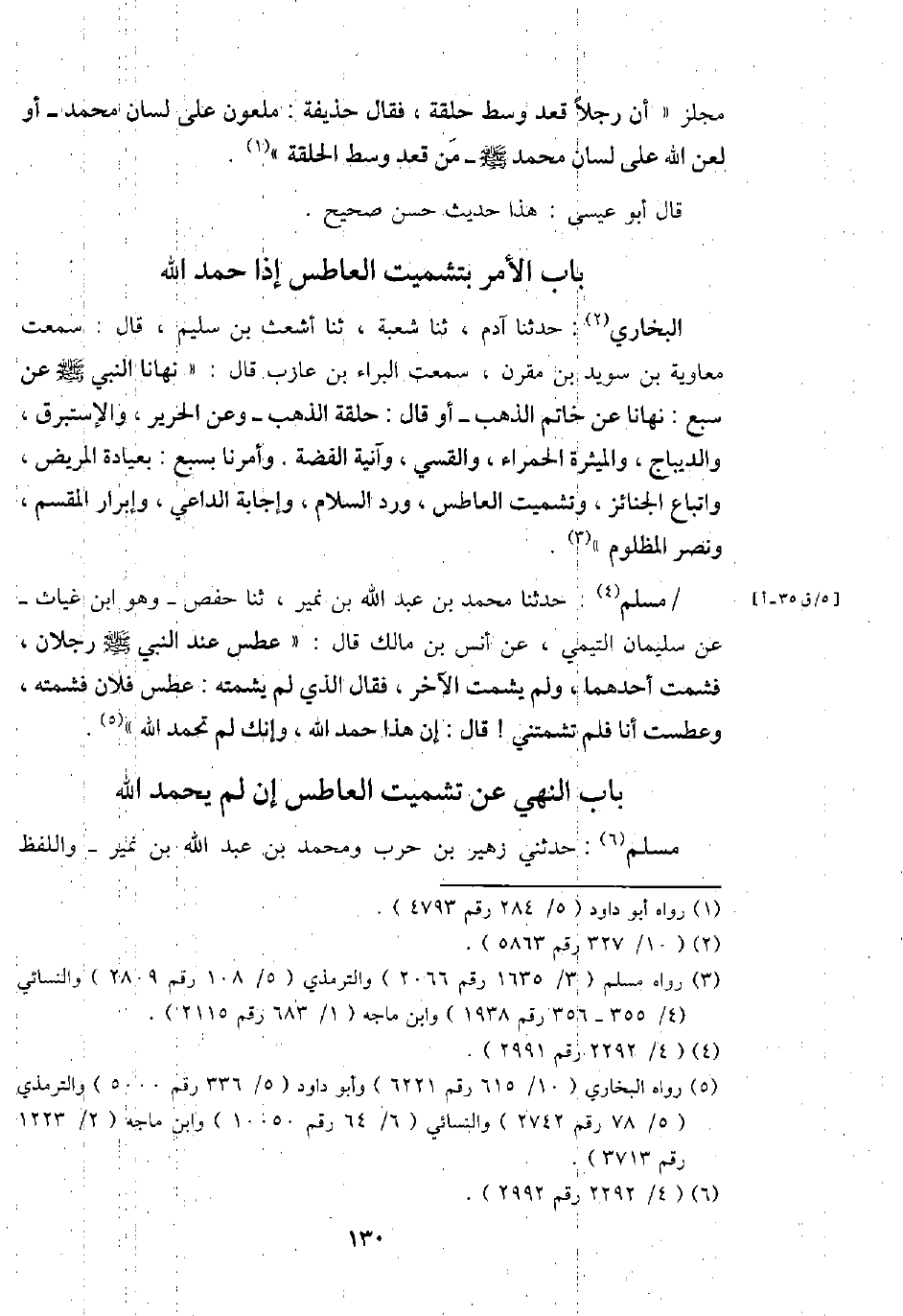 مُسلم: حَدثنَا مُحَمَّد بن عبد الله بن نمير، ثَنَا حَفْص - وَهُوَ ابْن غياث - عَن سُلَيْمَان التَّيْمِيّ، عَن أنس بن مَالك قَالَ: " عطس عِنْد النَّبِي - صَلَّى اللَّهُ عَلَيْهِ وَسَلَّم َ - رجلَانِ، فشمت أَحدهمَا، وَلم يشمت الآخر، فَقَالَ الَّذِي لم يشمته: عطس فلَان فشمته، وعطست أَنا فَلم تشمتني! قَالَ: إِن هَذَا حمد لله، وَإنَّك لم تحمد الله ".