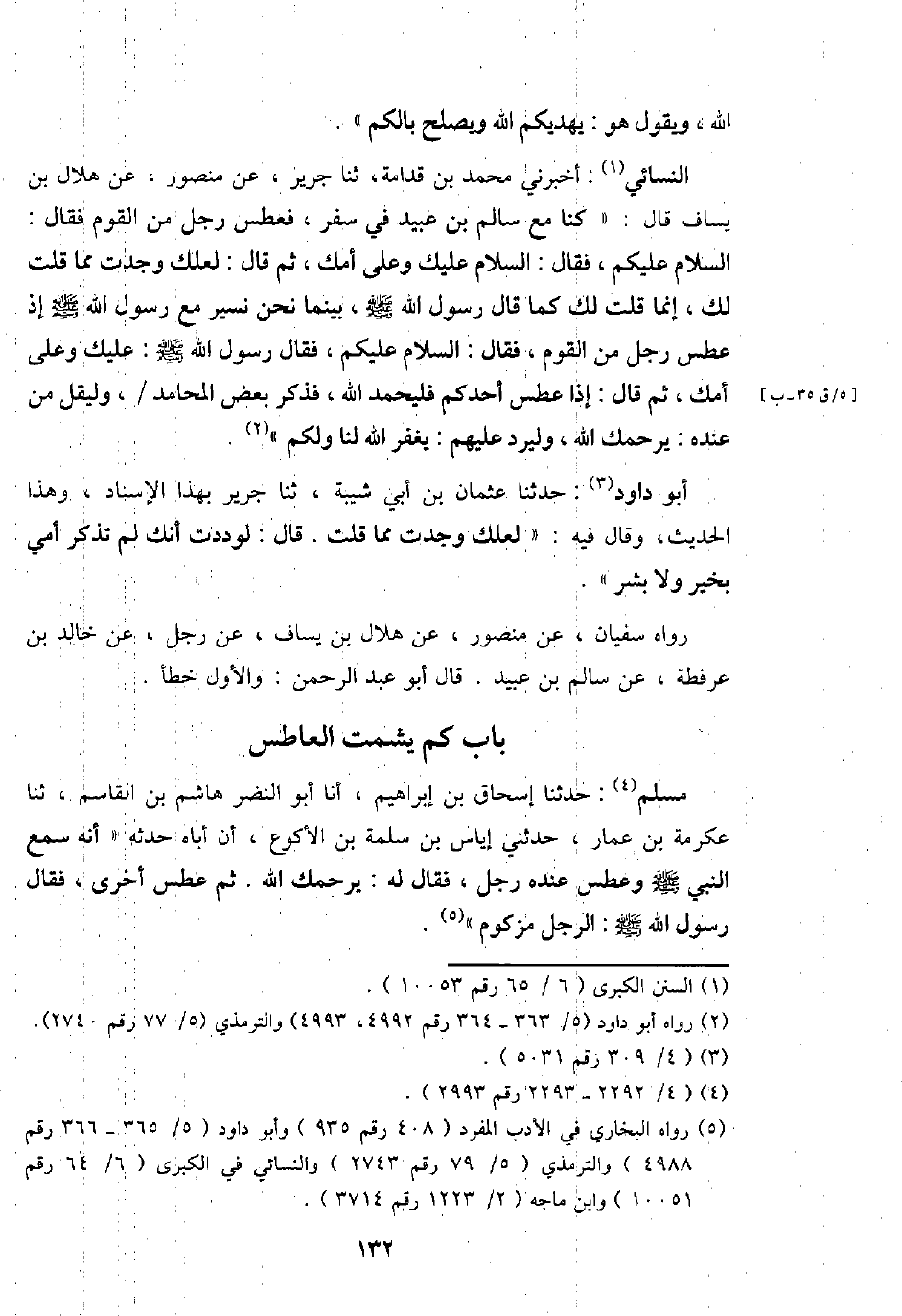 مُسلم: حَدثنَا إِسْحَاق بن إِبْرَاهِيم، أَنا أَبُو النَّضر هَاشم بن الْقَاسِم، ثَنَا عِكْرِمَة بن عمار، حَدثنِي إِيَاس بن سَلمَة بن الْأَكْوَع، أَن أَبَاهُ حَدثهُ " أَنه سمع النَّبِي - صَلَّى اللَّهُ عَلَيْهِ وَسَلَّم َ - وعطس عِنْده رجل، فَقَالَ لَهُ: يَرْحَمك الله. ثمَّ عطس أُخْرَى، فَقَالَ رَسُول الله - صَلَّى اللَّهُ عَلَيْهِ وَسَلَّم َ -: الرجل مزكوم ".