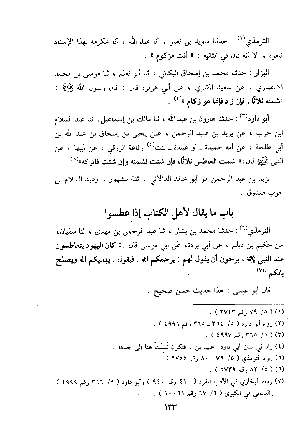 التِّرْمِذِيّ: حَدثنَا مُحَمَّد بن بشار، ثَنَا عبد الرَّحْمَن بن مهْدي، ثَنَا سُفْيَان، عَن حَكِيم بن دَيْلَم، عَن أبي بردة، عَن أبي مُوسَى قَالَ: " كَانَ الْيَهُود يتعاطسون عِنْد النَّبِي - صَلَّى اللَّهُ عَلَيْهِ وَسَلَّم َ -، يرجون أَن يَقُول لَهُم: يَرْحَمكُمْ الله. فَيَقُول: يهديكم الله وَيصْلح بالكم ".