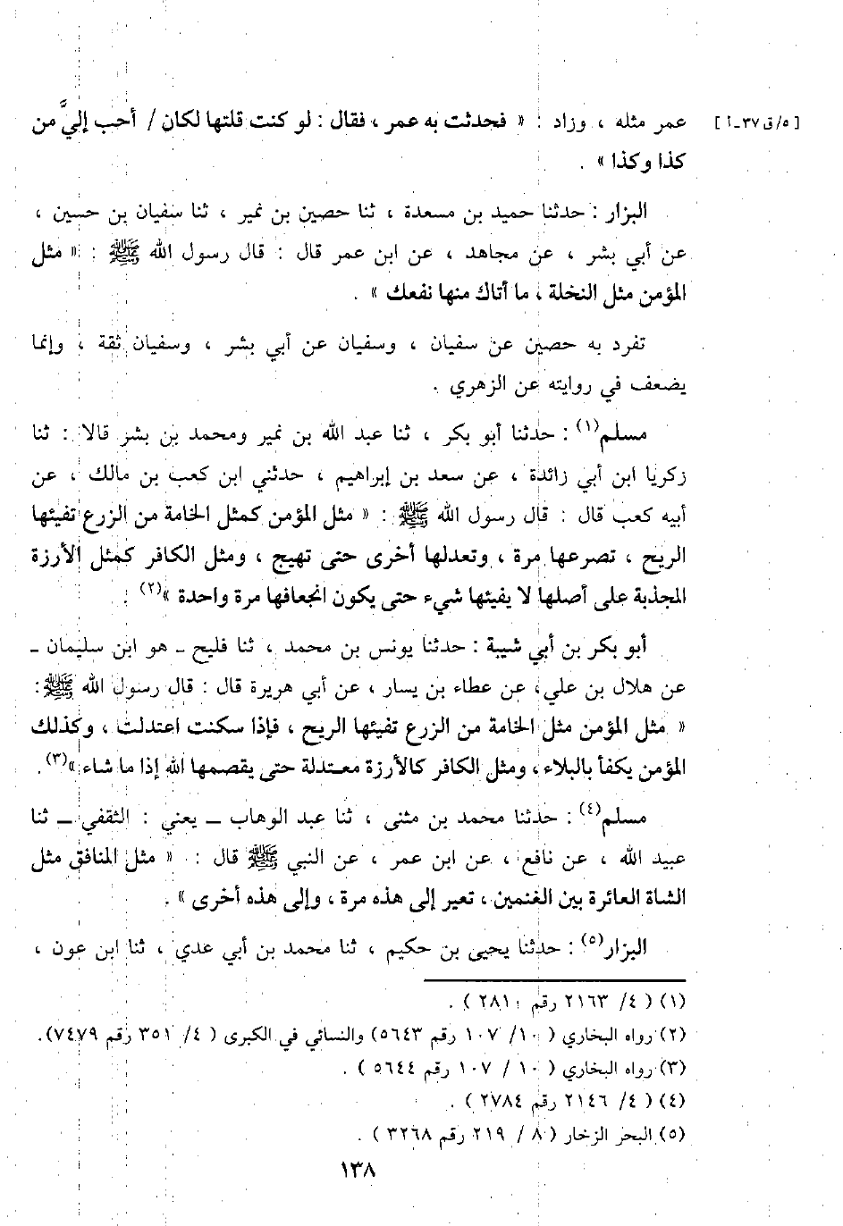 مُسلم: حَدثنَا أَبُو بكر، ثَنَا عبد الله بن نمير وَمُحَمّد بن بشر قَالَا: ثَنَا زَكَرِيَّا ابْن أبي زَائِدَة، عَن سعد بن إِبْرَاهِيم، حَدثنِي ابْن كَعْب بن مَالك، عَن أَبِيه كَعْب قَالَ: قَالَ رَسُول الله - صَلَّى اللَّهُ عَلَيْهِ وَسَلَّم َ -: " مثل الْمُؤمن كَمثل الخامة من الزَّرْع تفيئها الرّيح، تصرعها مرّة، وتعدلها أُخْرَى حَتَّى تهيج، وَمثل الْكَافِر كَمثل الأرزة المجذبة على أَصْلهَا لَا يفيئها شَيْء حَتَّى يكون انجعافها مرّة وَاحِدَة ".