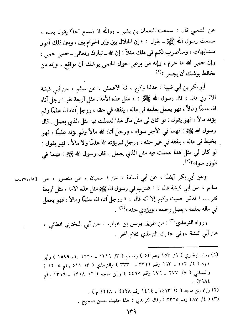 أَبُو بكر بن أبي شيبَة: حَدثنَا وَكِيع، ثَنَا الْأَعْمَش، عَن سَالم، عَن أبي كَبْشَة الْأَنمَارِي قَالَ: قَالَ رَسُول الله - صَلَّى اللَّهُ عَلَيْهِ وَسَلَّم َ -: " مثل هَذِه الْأمة، مثل أَرْبَعَة نفر: رجل آتَاهُ الله علما ومالاً، فَهُوَ يعْمل بِعِلْمِهِ فِي مَاله، يُنْفِقهُ فِي حَقه، وَرجل آتَاهُ الله علما وَلم يؤته مَالا، فَهُوَ يَقُول: لَو كَانَ لي مثل مَال هَذَا لعملت فِيهِ مثل الَّذِي يعْمل. قَالَ رَسُول الله - صَلَّى اللَّهُ عَلَيْهِ وَسَلَّم َ -: فهما فِي الْأجر سَوَاء، وَرجل آتَاهُ الله مَالا وَلم يؤته علما، فَهُوَ يخبط فِي مَاله، يُنْفِقهُ فِي غير حَقه، وَرجل لم يؤته الله علما وَلَا مَالا، فَهُوَ يَقُول: لَو كَانَ لي مثل هَذَا عملت فِيهِ مثل الَّذِي يعْمل. قَالَ رَسُول الله - صَلَّى اللَّهُ عَلَيْهِ وَسَلَّم َ -: فهما فِي الْوزر سَوَاء ".
