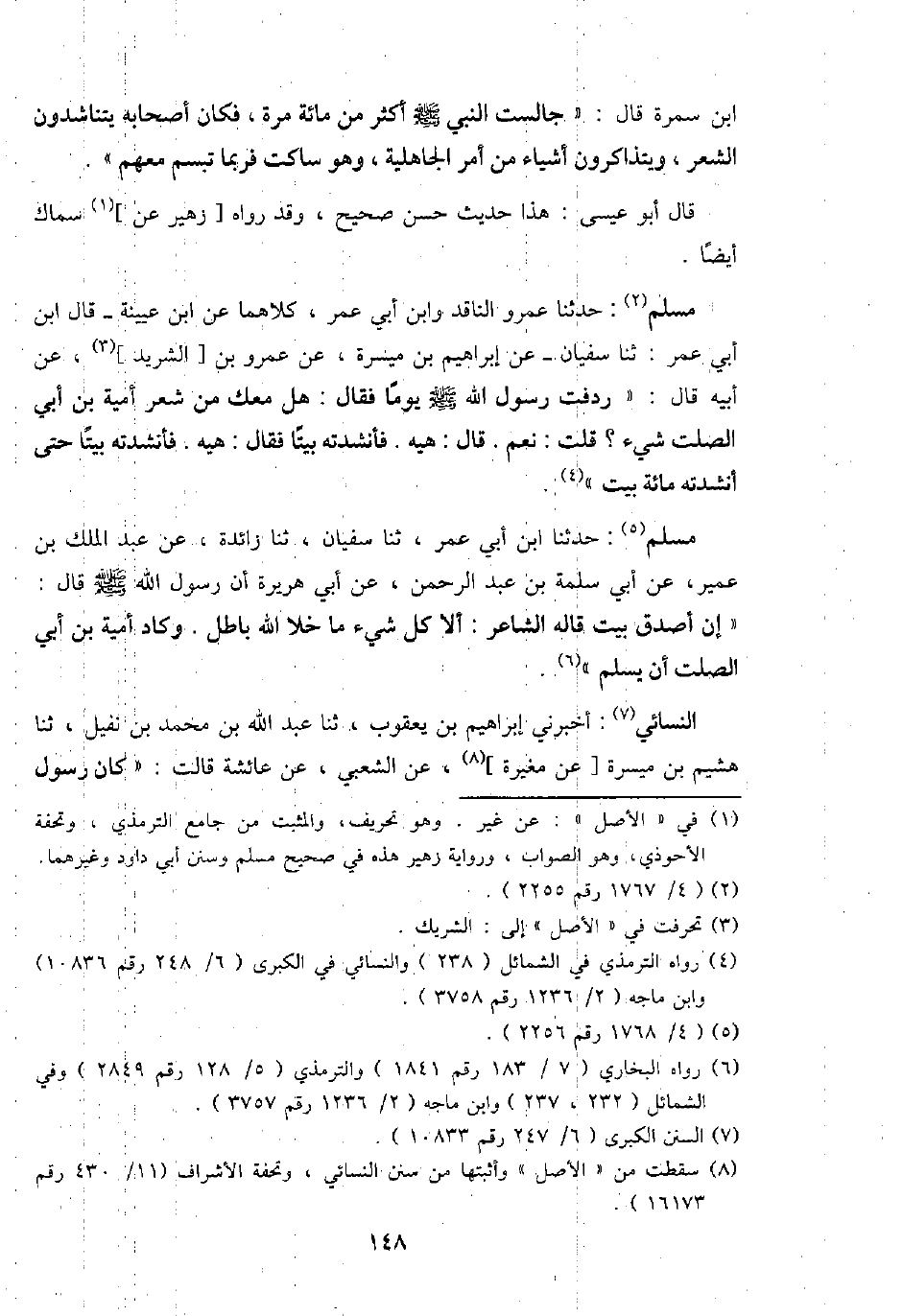 مُسلم: حَدثنَا عَمْرو النَّاقِد وَابْن أبي عمر، كِلَاهُمَا عَن ابْن عُيَيْنَة - قَالَ ابْن أبي عمر: ثَنَا سُفْيَان - عَن إِبْرَاهِيم بن ميسرَة، عَن عَمْرو بن [الشريد] ، عَن أَبِيه قَالَ: " ردفت رَسُول الله - صَلَّى اللَّهُ عَلَيْهِ وَسَلَّم َ - يَوْمًا فَقَالَ: هَل مَعَك من شعر أُميَّة بن أبي الصَّلْت شَيْء؟ قلت: نعم. قَالَ: هيه. فَأَنْشَدته بَيْتا فَقَالَ: هيه. أنشدته بَيْتا حَتَّى أنشدته مائَة بَيت ".