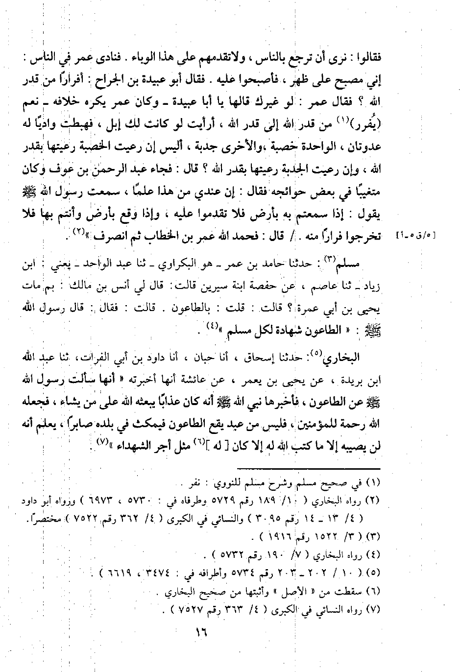 مُسلم: حَدثنَا حَامِد بن عمر - هُوَ البكراوي - ثَنَا عبد الْوَاحِد - يَعْنِي: ابْن زِيَاد - ثَنَا عَاصِم، عَن حَفْصَة ابْنة سِيرِين قَالَت: قَالَ لي أنس بن مَالك: بِمَ مَاتَ يحيى بن أبي عمْرَة؟ قَالَت: قلت: بالطاعون. قَالَت: فَقَالَ: قَالَ رَسُول الله - صَلَّى اللَّهُ عَلَيْهِ وَسَلَّم َ -: " الطَّاعُون شَهَادَة لكل مُسلم ".