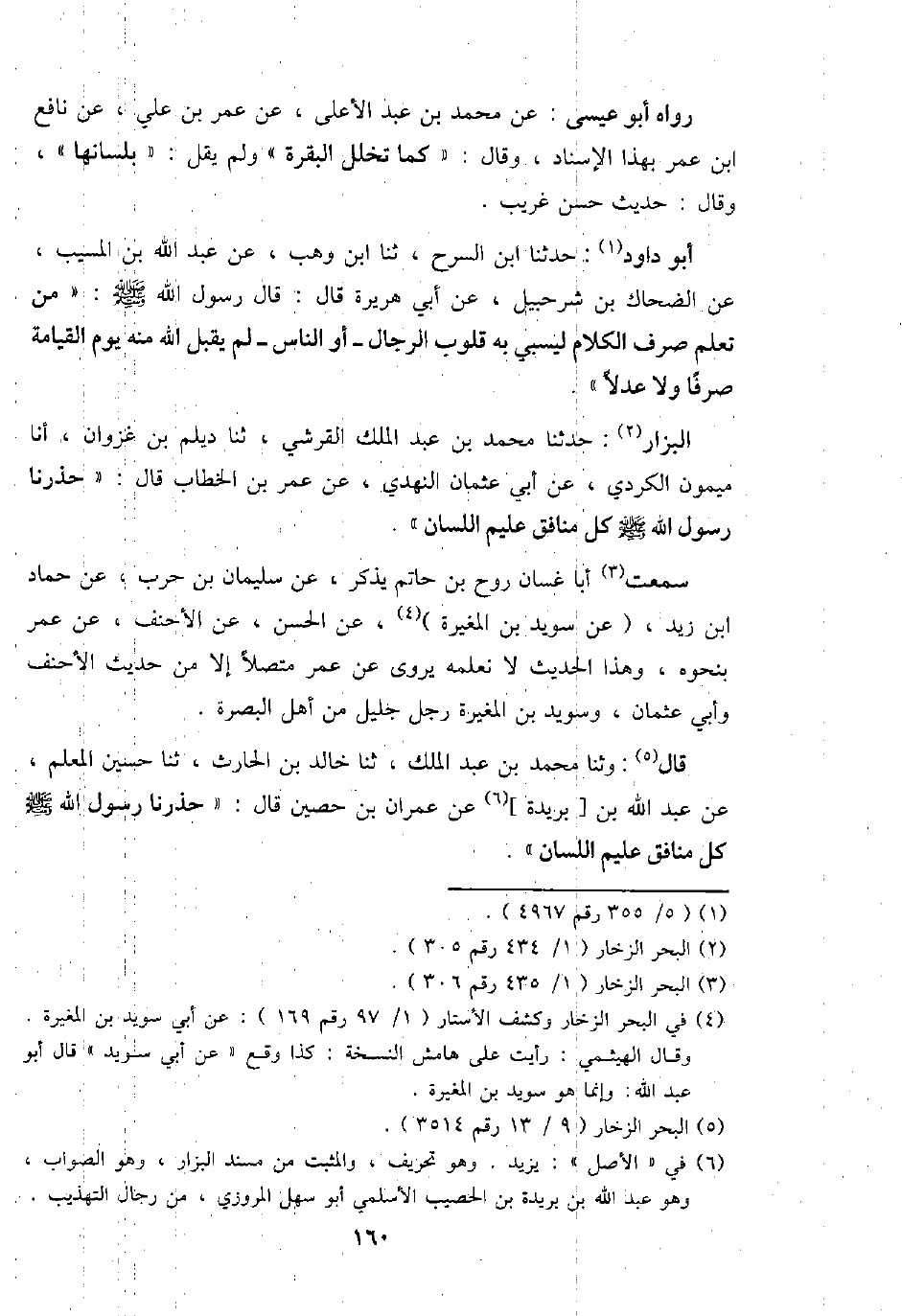 قَالَ: وثنا مُحَمَّد بن عبد الْملك، ثَنَا خَالِد بن الْحَارِث، ثَنَا حُسَيْن الْمعلم، عَن عبد الله بن [بُرَيْدَة] عَن عمرَان بن حُصَيْن قَالَ: " حذرنا رَسُول الله - صَلَّى اللَّهُ عَلَيْهِ وَسَلَّم َ - كل مُنَافِق عليم اللِّسَان ".