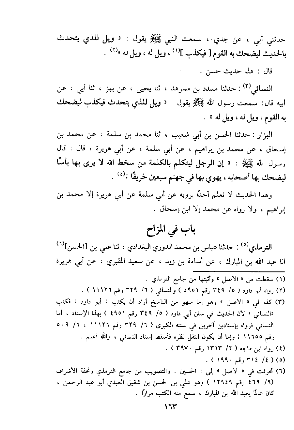 النَّسَائِيّ: حَدثنَا مُسَدّد بن مسرهد، ثَنَا يحيى، عَن بهز، ثَنَا أبي، عَن أَبِيه قَالَ: سَمِعت رَسُول الله - صَلَّى اللَّهُ عَلَيْهِ وَسَلَّم َ - يَقُول: " ويل للَّذي يتحدث فيكذب ليضحك بِهِ الْقَوْم، ويل لَهُ، ويل لَهُ ".