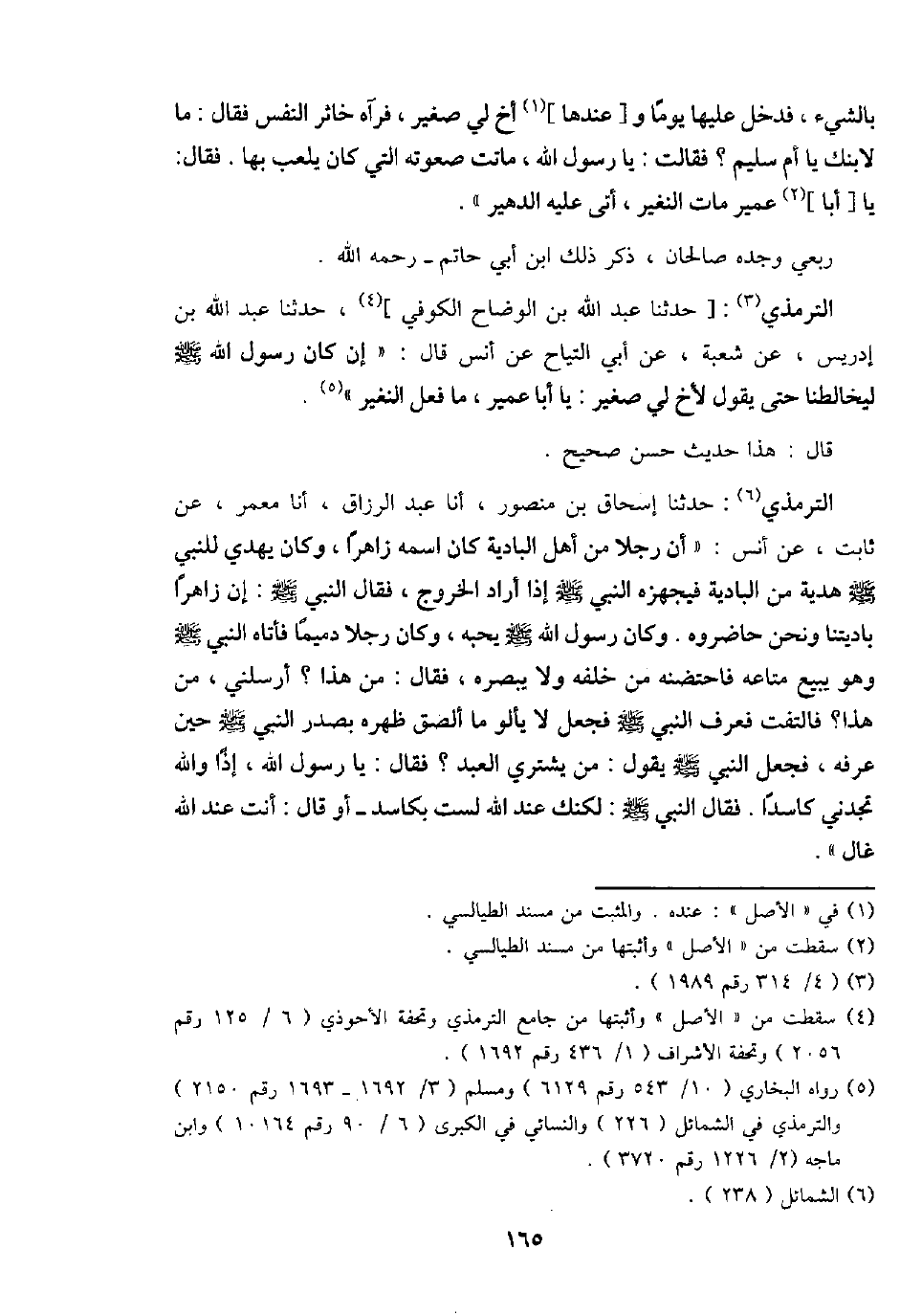 التِّرْمِذِيّ: حَدثنَا إِسْحَاق بن مَنْصُور، أَنا عبد الرَّزَّاق، أَنا معمر، عَن ثَابت، عَن أنس: " أَن رجلا من أهل الْبَادِيَة كَانَ اسْمه زاهراً، وَكَانَ يهدي للنَّبِي - صَلَّى اللَّهُ عَلَيْهِ وَسَلَّم َ - هَدِيَّة من الْبَادِيَة فيجهزه النَّبِي - صَلَّى اللَّهُ عَلَيْهِ وَسَلَّم َ - إِذا أَرَادَ الْخُرُوج، فَقَالَ النَّبِي - صَلَّى اللَّهُ عَلَيْهِ وَسَلَّم َ -: إِن زاهراً باديتنا وَنحن حاضروه. وَكَانَ رَسُول الله - صَلَّى اللَّهُ عَلَيْهِ وَسَلَّم َ - يُحِبهُ، وَكَانَ رجلا دميماً فَأَتَاهُ النَّبِي - صَلَّى اللَّهُ عَلَيْهِ وَسَلَّم َ - وَهُوَ يَبِيع مَتَاعه فَاحْتَضَنَهُ من خَلفه وَلَا يبصره، فَقَالَ: من هَذَا؟ أَرْسلنِي، من هَذَا؟ فَالْتَفت فَعرف النَّبِي - صَلَّى اللَّهُ عَلَيْهِ وَسَلَّم َ - فَجعل لَا يألو مَا ألصق ظَهره بصدر النَّبِي - صَلَّى اللَّهُ عَلَيْهِ وَسَلَّم َ - حِين عرفه، فَجعل النَّبِي - صَلَّى اللَّهُ عَلَيْهِ وَسَلَّم َ - يَقُول: من يَشْتَرِي العَبْد؟ فَقَالَ: يَا رَسُول الله، إِذا وَالله تجدني كاسداً. فَقَالَ النَّبِي - صَلَّى اللَّهُ عَلَيْهِ وَسَلَّم َ -: لكنك عِنْد الله لَيست بكاسد - أَو قَالَ: أَنْت عِنْد الله غال ".