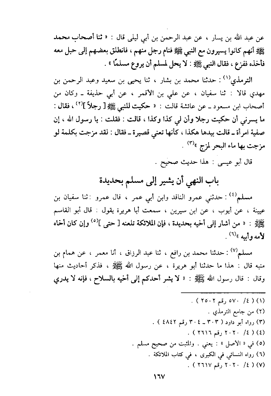 مُسلم: حَدثنِي عَمْرو النَّاقِد وَابْن أبي عمر، قَالَ: عَمْرو: ثَنَا سُفْيَان بن عُيَيْنَة، عَن أَيُّوب، عَن ابْن سِيرِين، سَمِعت أَبَا هُرَيْرَة يَقُول: قَالَ أَبُو الْقَاسِم - صَلَّى اللَّهُ عَلَيْهِ وَسَلَّم َ -: " من أَشَارَ إِلَى أَخِيه بحديدة، فَإِن الْمَلَائِكَة تلعنه [حَتَّى] وَإِن كَانَ أَخَاهُ لأمه وَأَبِيهِ ".