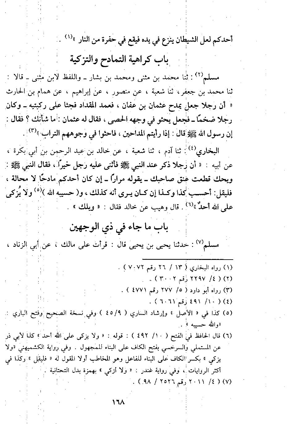 مُسلم: ثَنَا مُحَمَّد بن مثنى وَمُحَمّد بن بشار - وَاللَّفْظ لِابْنِ مثنى - قَالَا ثَنَا مُحَمَّد بن جَعْفَر، ثَنَا شُعْبَة، عَن مَنْصُور، عَن إِبْرَاهِيم، عَن همام بن الْحَارِث " أَن رجلا جعل يمدح عُثْمَان بن عَفَّان، فَعمد الْمِقْدَاد فَجَثَا على رُكْبَتَيْهِ - وَكَانَ رجلا ضخماً - فَجعل يحثو فِي وَجهه الْحَصَى، فَقَالَ لَهُ عُثْمَان: مَا شَأْنك؟ فَقَالَ: إِن رَسُول الله - صَلَّى اللَّهُ عَلَيْهِ وَسَلَّم َ - قَالَ: إِذا رَأَيْتُمْ المداحين، فاحثوا فِي وُجُوههم التُّرَاب ".