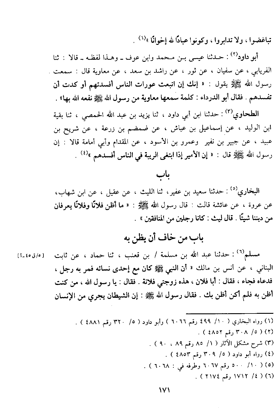 مُسلم: حَدثنَا عبد الله بن مسلمة بن قعنب، ثَنَا حَمَّاد، عَن ثَابت الْبنانِيّ، عَن أنس بن مَالك " أَن النَّبِي - صَلَّى اللَّهُ عَلَيْهِ وَسَلَّم َ - كَانَ مَعَ إِحْدَى نِسَائِهِ فَمر بِهِ رجل، فَدَعَاهُ فجَاء، فَقَالَ: أَبَا فلَان، هَذِه زَوْجَتي فُلَانَة. فَقَالَ: يَا رَسُول الله، من كنت أَظن بِهِ فَلم أكن أَظن بك. فَقَالَ رَسُول الله - صَلَّى اللَّهُ عَلَيْهِ وَسَلَّم َ -: إِن الشَّيْطَان يجْرِي من الْإِنْسَان