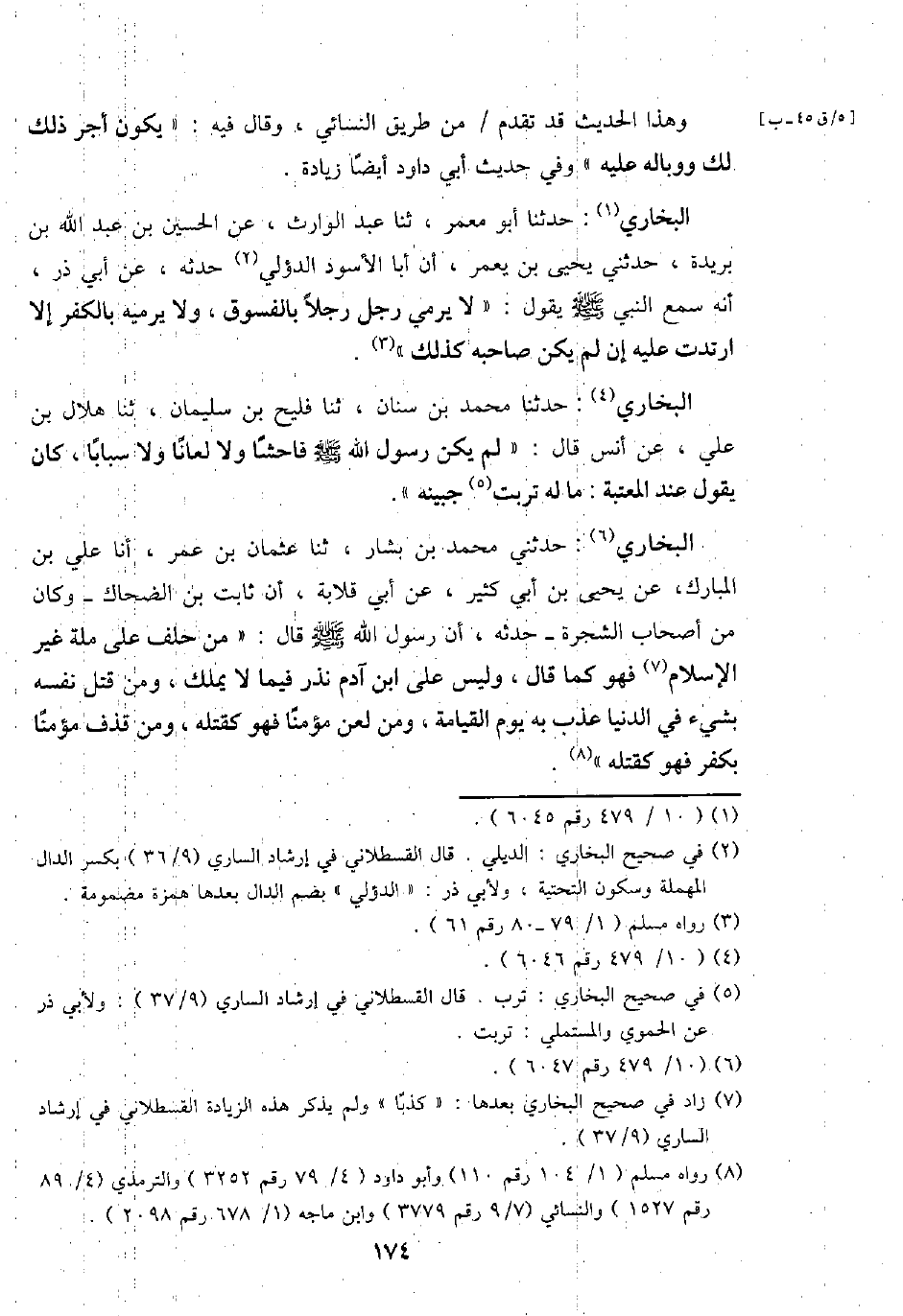 البُخَارِيّ: حَدثنَا أَبُو معمر، ثَنَا عبد الْوَارِث، عَن الْحُسَيْن بن عبد الله بن بُرَيْدَة، حَدثنِي يحيى بن يعمر، أَن أَبَا الْأسود الدؤَلِي حَدثهُ، عَن أبي ذَر، أَنه سمع النَّبِي - صَلَّى اللَّهُ عَلَيْهِ وَسَلَّم َ - يَقُول: " لَا يَرْمِي رجل رجلا بالفسوق، وَلَا يرميه بالْكفْر إِلَّا ارْتَدَّت عَلَيْهِ إِن لم يكن صَاحبه كَذَلِك ".