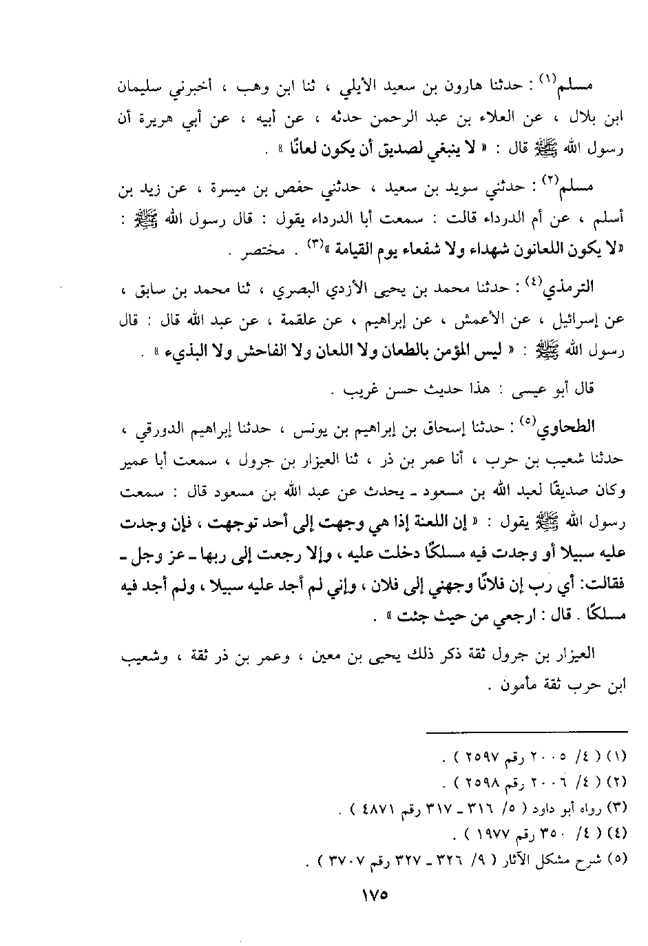 مُسلم: حَدثنَا هَارُون بن سعيد الْأَيْلِي، ثَنَا ابْن وهب، أَخْبرنِي سُلَيْمَان ابْن بِلَال، عَن الْعَلَاء بن عبد الرَّحْمَن حَدثهُ، عَن أَبِيه، عَن أبي هُرَيْرَة أَن رَسُول الله - صَلَّى اللَّهُ عَلَيْهِ وَسَلَّم َ - قَالَ: " لَا يَنْبَغِي لصديق أَن يكون لعاناً ".