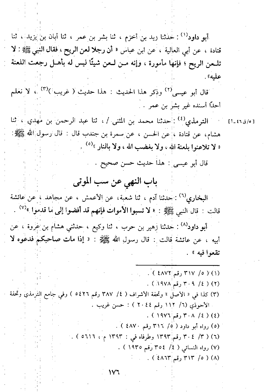 أَبُو دَاوُد: حَدثنَا زيد بن أخزم، ثَنَا بشر بن عمر، ثَنَا أبان بن يزِيد، ثَنَا قَتَادَة، عَن أبي الْعَالِيَة، عَن ابْن عَبَّاس " أَن رجلا لعن الرّيح، فَقَالَ النَّبِي - صَلَّى اللَّهُ عَلَيْهِ وَسَلَّم َ -: لَا تلعن الرّيح؛ فَإِنَّهَا مأمورة، وَإنَّهُ من لعن شَيْئا لَيْسَ لَهُ بِأَهْل رجعت اللَّعْنَة عَلَيْهِ ".