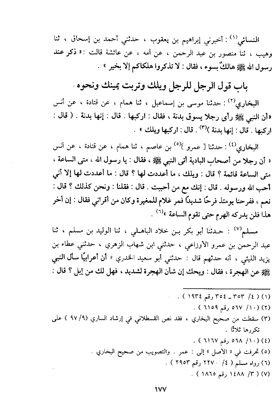 مُسلم: حَدثنَا أَبُو بكر بن خَلاد الْبَاهِلِيّ، ثَنَا الْوَلِيد بن مُسلم، ثَنَا عبد الرَّحْمَن بن عَمْرو الْأَوْزَاعِيّ، حَدثنِي ابْن شهَاب الزُّهْرِيّ، حَدثنِي عَطاء بن يزِيد اللَّيْثِيّ، أَنه حَدثهمْ قَالَ: حَدثنِي أَبُو سعيد الْخُدْرِيّ " أَن أَعْرَابِيًا سَأَلَ النَّبِي - صَلَّى اللَّهُ عَلَيْهِ وَسَلَّم َ - عَن الْهِجْرَة، فَقَالَ: وَيحك إِن شَأْن الْهِجْرَة لشديد، فَهَل لَك من إبل؟ قَالَ: