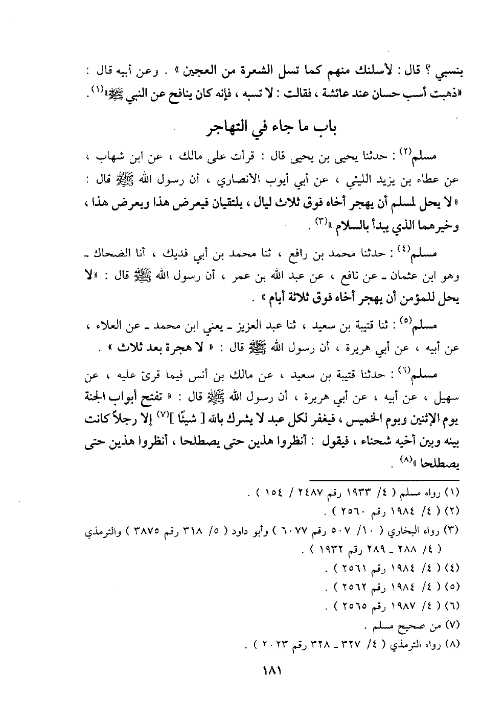 مُسلم: حَدثنَا يحيى بن يحيى قَالَ: قَرَأت على مَالك، عَن ابْن شهَاب، عَن عَطاء بن يزِيد اللَّيْثِيّ، عَن أبي أَيُّوب الْأنْصَارِيّ، أَن رَسُول الله - صَلَّى اللَّهُ عَلَيْهِ وَسَلَّم َ - قَالَ: " لَا يحل لمُسلم أَن يهجر أَخَاهُ فَوق ثَلَاث لَيَال، يَلْتَقِيَانِ فَيعرض هَذَا ويعرض هَذَا، وخيرهما الَّذِي يبْدَأ بِالسَّلَامِ ".