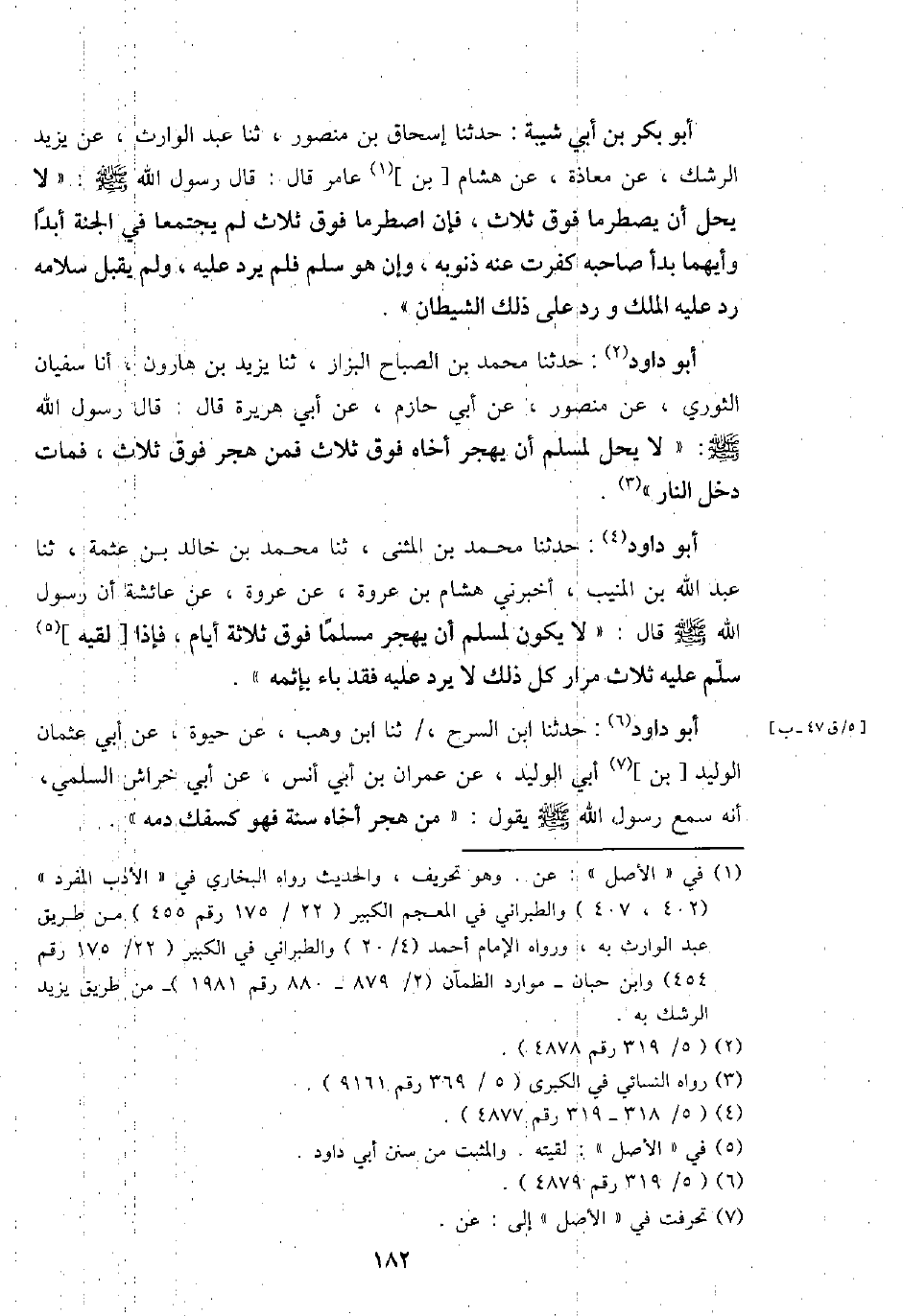 أَبُو دَاوُد: حَدثنَا مُحَمَّد بن الصَّباح الْبَزَّار، ثَنَا يزِيد بن هَارُون، أَنا سُفْيَان الثَّوْريّ، عَن مَنْصُور، عَن أبي حَازِم، عَن أبي هُرَيْرَة قَالَ: قَالَ رَسُول الله - صَلَّى اللَّهُ عَلَيْهِ وَسَلَّم َ -: " لَا يحل لمُسلم أَن يهجر أَخَاهُ فَوق ثَلَاث فَمن هجر فَوق ثَلَاث، فَمَاتَ دخل النَّار ".