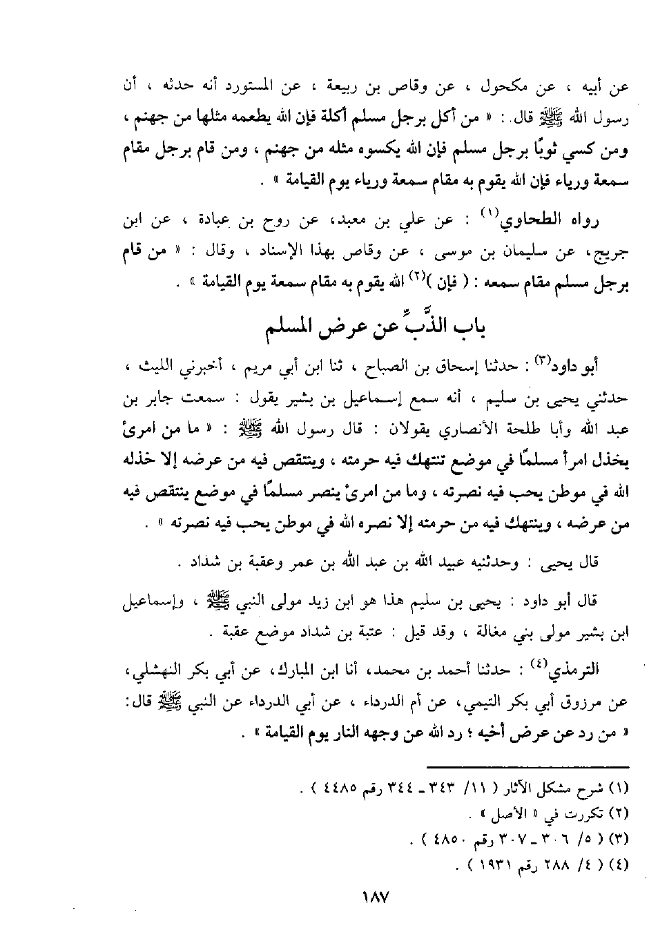 التِّرْمِذِيّ: حَدثنَا أَحْمد بن مُحَمَّد، أَنا ابْن الْمُبَارك، عَن أبي بكر النَّهْشَلِي، عَن مَرْزُوق أبي بكر التَّيْمِيّ، عَن أم الدَّرْدَاء، عَن أبي الدَّرْدَاء عَن النَّبِي - صَلَّى اللَّهُ عَلَيْهِ وَسَلَّم َ - قَالَ: " من رد عَن عرض أَخِيه؛ رد الله عَن وَجهه النَّار يَوْم الْقِيَامَة ".
