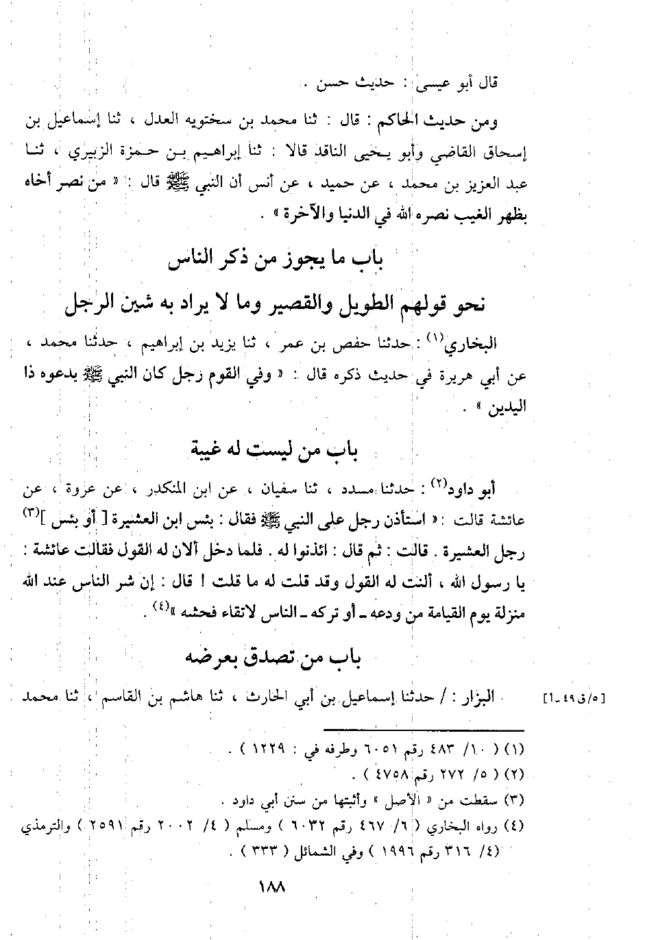 أَبُو دَاوُد: حَدثنَا مُسَدّد، ثَنَا سُفْيَان، عَن ابْن الْمُنْكَدر، عَن عُرْوَة، عَن عَائِشَة قَالَت: " اسْتَأْذن رجل على النَّبِي - صَلَّى اللَّهُ عَلَيْهِ وَسَلَّم َ - فَقَالَ: بئس ابْن الْعَشِيرَة [أَو بئس] رجل الْعَشِيرَة. قَالَت: ثمَّ قَالَ: ائذنوا لَهُ. فَلَمَّا دخل ألان لَهُ القَوْل فَقَالَت عَائِشَة: يَا رَسُول الله، ألنت لَهُ القَوْل وَقد قلت لَهُ مَا قلت قَالَ: إِن شَرّ النَّاس عِنْد الله منزلَة يَوْم الْقِيَامَة من ودعه - أَو تَركه - النَّاس لاتقاء فحشه ".