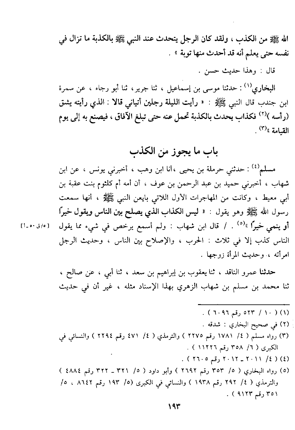 مُسلم: حَدثنِي حَرْمَلَة بن يحيى، أَنا ابْن وهب، أَخْبرنِي يُونُس، عَن ابْن شهَاب، أَخْبرنِي حميد بن عبد الرَّحْمَن بن عَوْف، أَن أمه أم كُلْثُوم بنت عقبَة بن أبي معيط، وَكَانَت من الْمُهَاجِرَات الأول اللَّاتِي بايعن النَّبِي - صَلَّى اللَّهُ عَلَيْهِ وَسَلَّم َ -، أَنَّهَا سَمِعت رَسُول الله - صَلَّى اللَّهُ عَلَيْهِ وَسَلَّم َ - وَهُوَ يَقُول: " لَيْسَ الْكذَّاب الَّذِي يصلح بَين النَّاس وَيَقُول خيرا أَو ينمي خيرا ". قَالَ ابْن شهَاب: وَلم أسمع يرخص فِي شَيْء مِمَّا يَقُول النَّاس كذب إِلَّا فِي ثَلَاث: الْحَرْب، والإصلاح بَين النَّاس، وَحَدِيث الرجل امْرَأَته، وَحَدِيث الْمَرْأَة زَوجهَا.