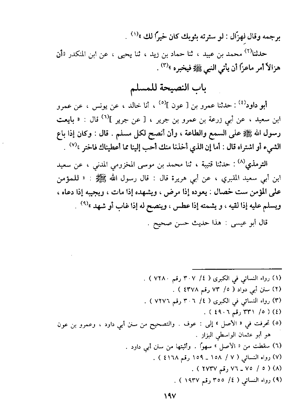 أَبُو دَاوُد: حَدثنَا عَمْرو بن [عون] ، أَنا خَالِد، عَن يُونُس، عَن عَمْرو ابْن سعيد، عَن أبي زرْعَة بن عَمْرو بن جرير، [عَن جرير] قَالَ: " بَايَعت رَسُول الله - صَلَّى اللَّهُ عَلَيْهِ وَسَلَّم َ - على السّمع وَالطَّاعَة، وَأَن أنصح لكل مُسلم. قَالَ: وَكَانَ إِذا بَاعَ الشَّيْء أَو اشْتَرَاهُ قَالَ: أما إِن الَّذِي أَخذنَا مِنْك أحب إِلَيْنَا مِمَّا أعطيناك فاختر ".