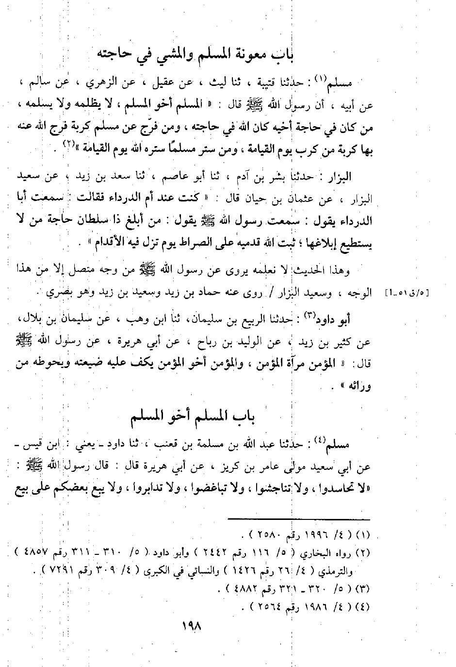 مُسلم: حَدثنَا قُتَيْبَة، ثَنَا لَيْث، عَن عقيل، عَن الزُّهْرِيّ، عَن سَالم، عَن أَبِيه، أَن رَسُول الله - صَلَّى اللَّهُ عَلَيْهِ وَسَلَّم َ - قَالَ: " الْمُسلم أَخُو الْمُسلم، لَا يَظْلمه وَلَا يُسلمهُ، من كَانَ فِي حَاجَة أَخِيه كَانَ الله فِي حَاجته، وَمن فرج عَن مُسلم كربَة فرج الله عَنهُ بهَا كربَة من كرب يَوْم الْقِيَامَة، وَمن ستر مُسلما ستره الله يَوْم الْقِيَامَة ".