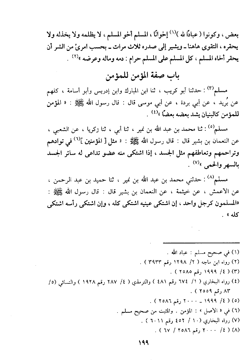 مُسلم: ثَنَا مُحَمَّد بن عبد الله بن نمير، ثَنَا أبي، ثَنَا زَكَرِيَّا، عَن الشّعبِيّ، عَن النُّعْمَان بن بشير قَالَ: قَالَ رَسُول الله - صَلَّى اللَّهُ عَلَيْهِ وَسَلَّم َ -: " مثل [الْمُؤمنِينَ] فِي توادهم وتراحمهم وتعاطفهم مثل الْجَسَد، إِذا اشْتَكَى مِنْهُ عُضْو تداعى لَهُ سَائِر الْجَسَد بالسهر والحمى ".