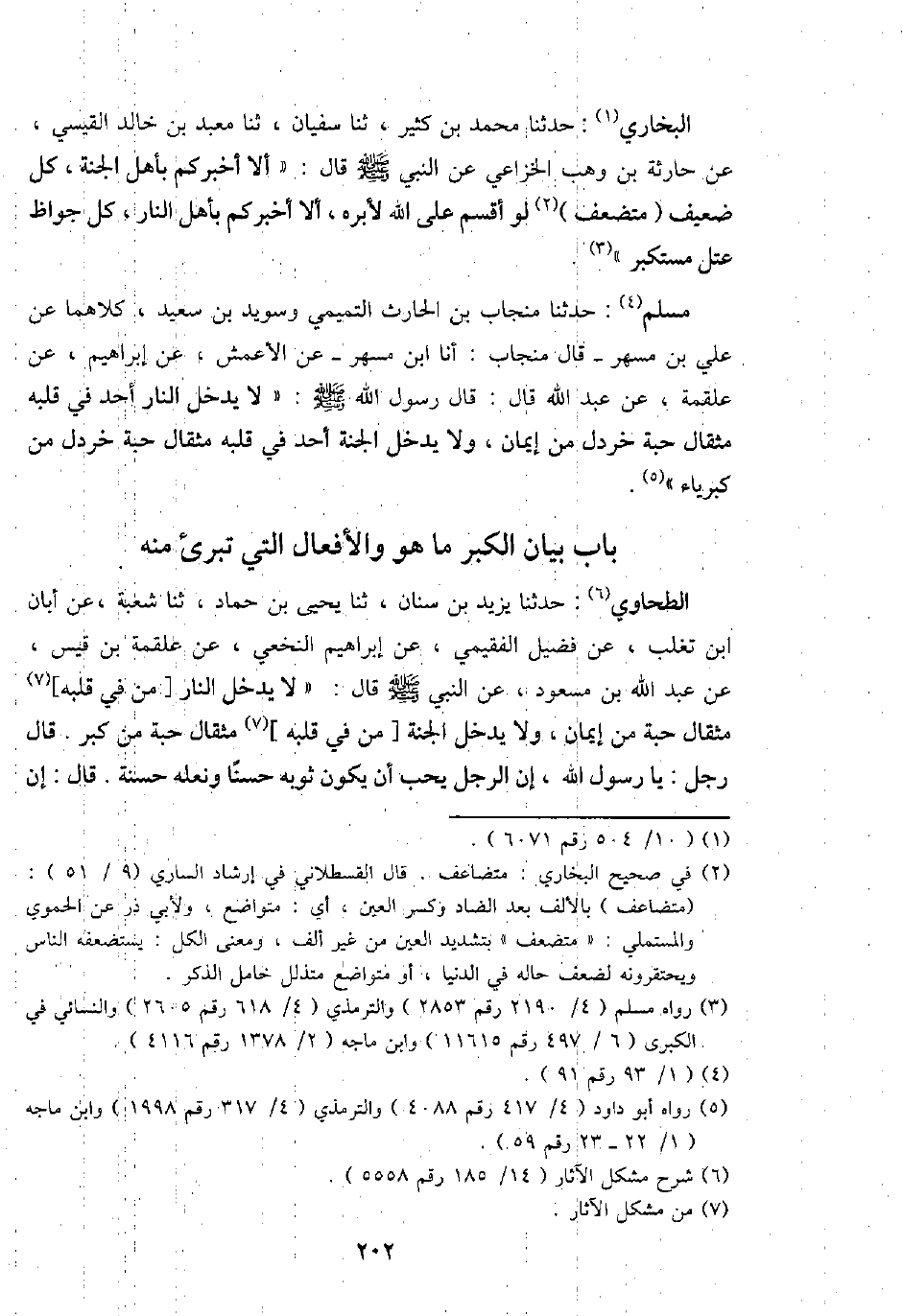 الطَّحَاوِيّ: حثنا يزِيد بن سِنَان، ثَنَا يحيى بن حَمَّاد، ثَنَا شُعْبَة، عَن أبان ابْن تغلب، عَن فُضَيْل الْفُقيْمِي، عَن إِبْرَاهِيم النَّخعِيّ، عَن عَلْقَمَة بن قيس، عَن عبد الله بن مَسْعُود، عَن النَّبِي - صَلَّى اللَّهُ عَلَيْهِ وَسَلَّم َ - قَالَ: " لَا يدْخل النَّار [من فِي قلبه] مِثْقَال حَبَّة من إِيمَان، وَلَا يدْخل الْجنَّة [من فِي قلبه] مِثْقَال حَبَّة من كبر. قَالَ رجل: يَا رَسُول الله، إِن الرجل يحب أَن يكون ثَوْبه حسنا وَنَعله حسنا. قَالَ: إِن