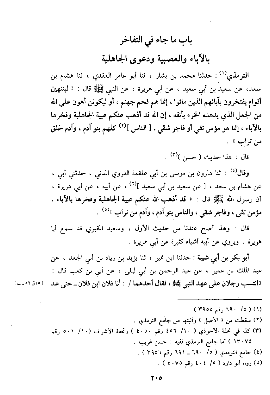 التِّرْمِذِيّ: حَدثنَا مُحَمَّد بن بشار، ثَنَا أَبُو عَامر الْعَقدي، ثَنَا هِشَام بن سعد، عَن سعيد بن أبي سعيد، عَن أبي هُرَيْرَة، عَن النَّبِي - صَلَّى اللَّهُ عَلَيْهِ وَسَلَّم َ - قَالَ: " لينتهين أَقوام يفتخرون بآبائهم الَّذين مَاتُوا، إِنَّمَا هم فَحم جَهَنَّم، أَو لَيَكُونن أَهْون على الله من الْجعل الَّذِي يدهده الخرء بِأَنْفِهِ، إِن الله قد أذهب عَنْكُم عبِّيَّة الْجَاهِلِيَّة وَفَخْرهَا بِالْآبَاءِ، إِنَّمَا هُوَ مُؤمن تَقِيّ أَو فَاجر شقي، [النَّاس] كلهم بَنو آدم، وآدَم خلق من تُرَاب ".