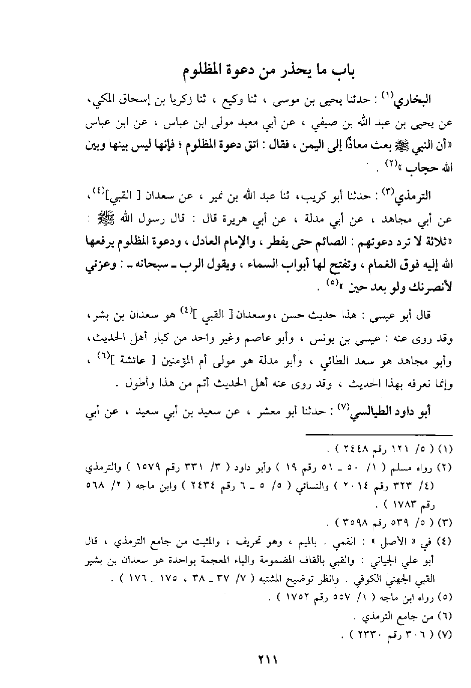 البُخَارِيّ: حَدثنَا يحيى بن مُوسَى، ثَنَا وَكِيع، ثَنَا زَكَرِيَّا بن إِسْحَاق الْمَكِّيّ، عَن يحيى بن عبد الله بن صَيْفِي، عَن أبي معبد مولى ابْن عَبَّاس، عَن ابْن عَبَّاس " أَن النَّبِي - صَلَّى اللَّهُ عَلَيْهِ وَسَلَّم َ - بعث معَاذًا إِلَى الْيمن. فَقَالَ: اتَّقِ دَعْوَة الْمَظْلُوم؛ فَإِنَّهَا لَيْسَ بَينهَا وَبَين الله حجاب ".