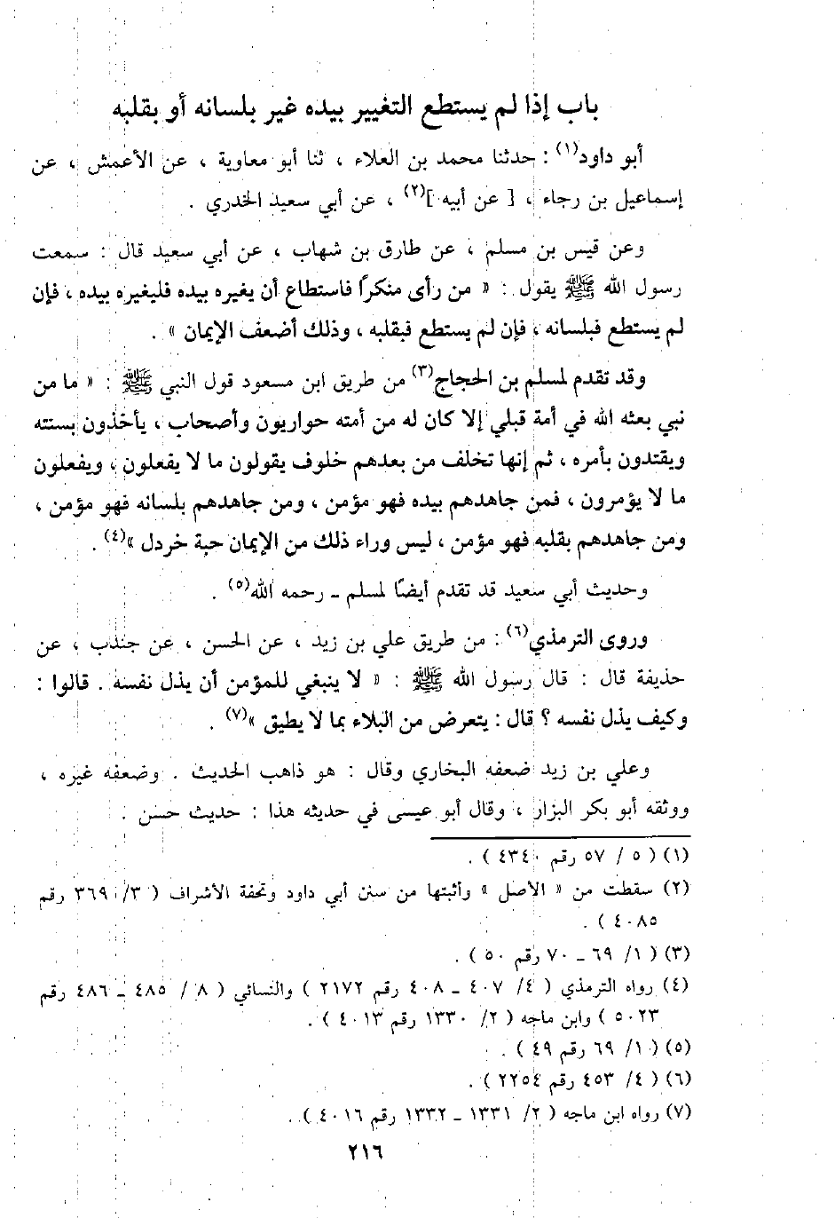 وَعَن قيس بن مُسلم، عَن طَارق بن شهَاب، عَن أبي سعيد قَالَ: سَمِعت رَسُول الله - صَلَّى اللَّهُ عَلَيْهِ وَسَلَّم َ - يَقُول: " من رأى مُنْكرا فاستطاع أَن يُغَيِّرهُ بِيَدِهِ فليغيره بِيَدِهِ، فَإِن لم يسْتَطع فبلسانه، فَإِن لم يسْتَطع فبقلبه، وَذَلِكَ أَضْعَف الْإِيمَان ".
