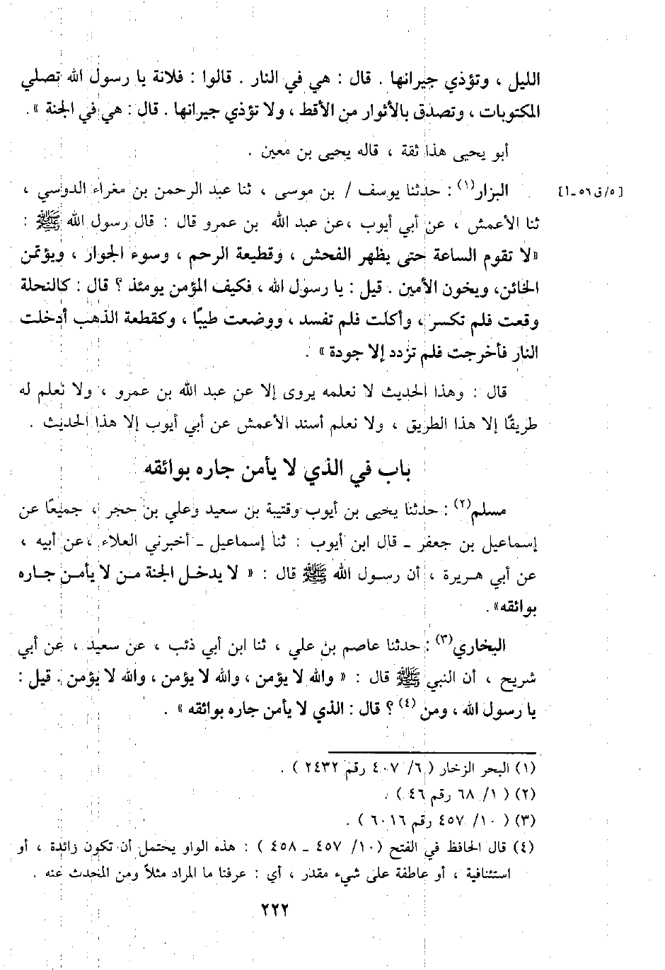 مُسلم: حَدثنَا يحيى بن أَيُّوب وقتيبة بن سعيد وَعلي بن حجر، جَمِيعًا عَن إِسْمَاعِيل بن جَعْفَر - قَالَ ابْن أَيُّوب: ثَنَا إِسْمَاعِيل - أَخْبرنِي الْعَلَاء، عَن أَبِيه، عَن أبي هُرَيْرَة، أَن رَسُول الله - صَلَّى اللَّهُ عَلَيْهِ وَسَلَّم َ - قَالَ: " لَا يدْخل الْجنَّة من لَا يَأْمَن جَاره بوائقه ".