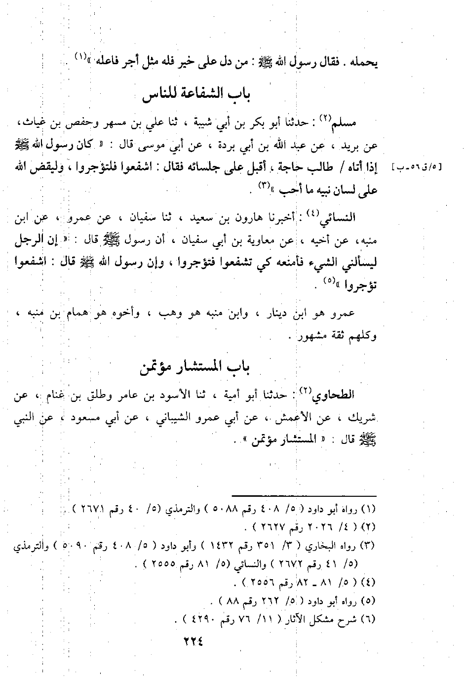 مُسلم: حَدثنَا أَبُو بكر بن أبي شيبَة، ثَنَا عَليّ بن مسْهر وَحَفْص بن غياث، عَن بريد، عَن عبد الله بن أبي بردة، عَن أبي مُوسَى قَالَ: " كَانَ رَسُول الله - صَلَّى اللَّهُ عَلَيْهِ وَسَلَّم َ - إِذا أَتَاهُ طَالب حَاجَة، أقبل على جُلَسَائِهِ فَقَالَ: اشفعوا فلتؤجروا، وليقض الله على لِسَان نبيه مَا أحب ".