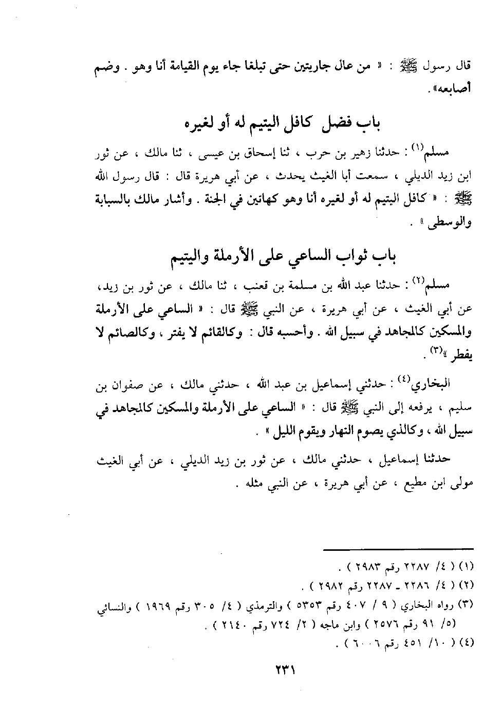مُسلم: حَدثنَا زُهَيْر بن حَرْب، ثَنَا إِسْحَاق بن عِيسَى، ثَنَا مَالك، عَن ثَوْر ابْن زيد الديلِي، سَمِعت أَبَا الْغَيْث يحدث، عَن أبي هُرَيْرَة قَالَ: قَالَ رَسُول الله - صَلَّى اللَّهُ عَلَيْهِ وَسَلَّم َ -: " كافل الْيَتِيم لَهُ أَو لغيره أَنا وَهُوَ كهاتين فِي الْجنَّة. وَأَشَارَ مَالك بالسبابة وَالْوُسْطَى ".