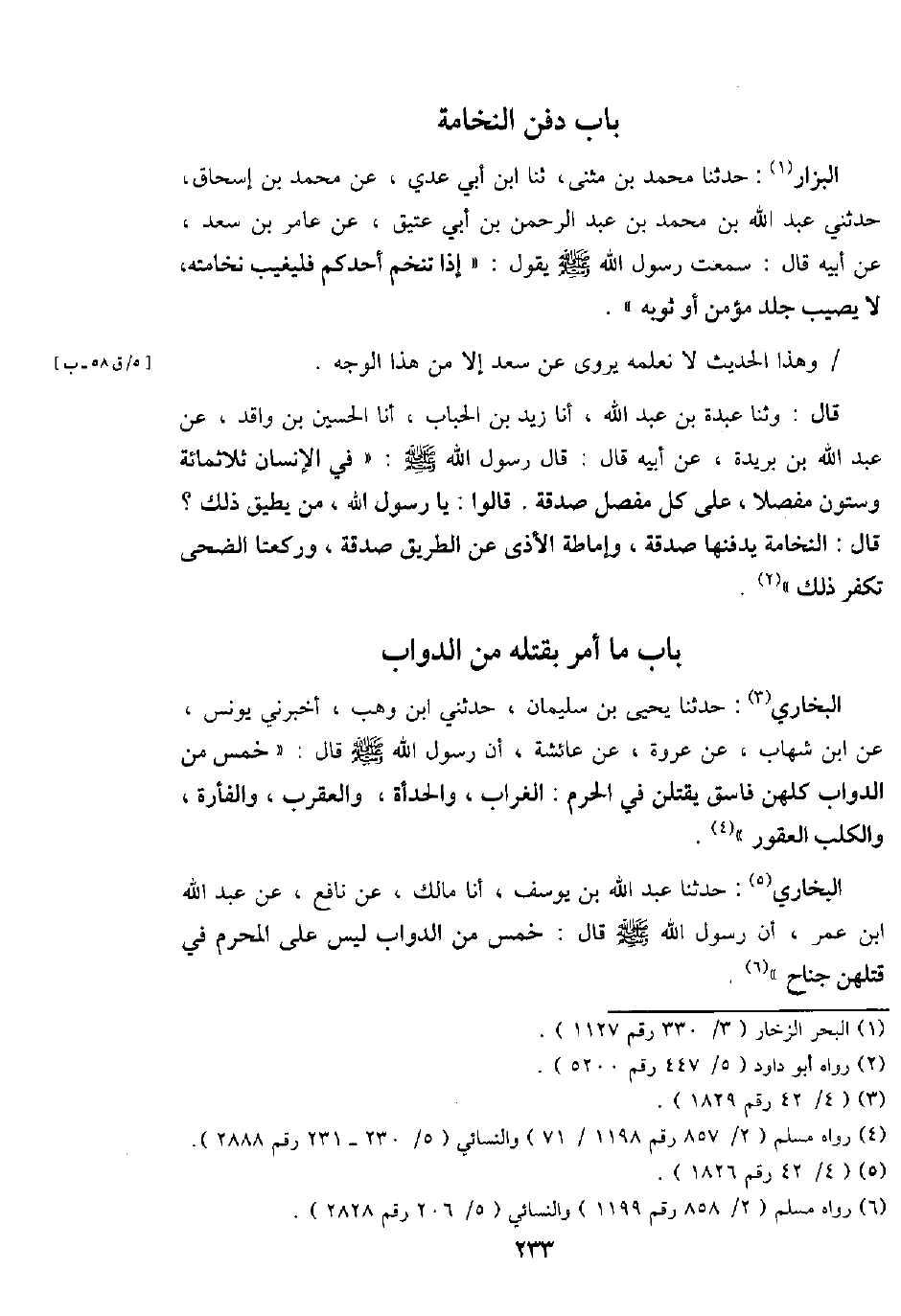 البُخَارِيّ: حَدثنَا عبد الله بن يُوسُف، أَنا مَالك، عَن نَافِع، عَن عبد الله ابْن عمر، أَن رَسُول الله - صَلَّى اللَّهُ عَلَيْهِ وَسَلَّم َ - قَالَ: خمس من الدَّوَابّ لَيْسَ على الْمحرم فِي قتلهن جنَاح ".