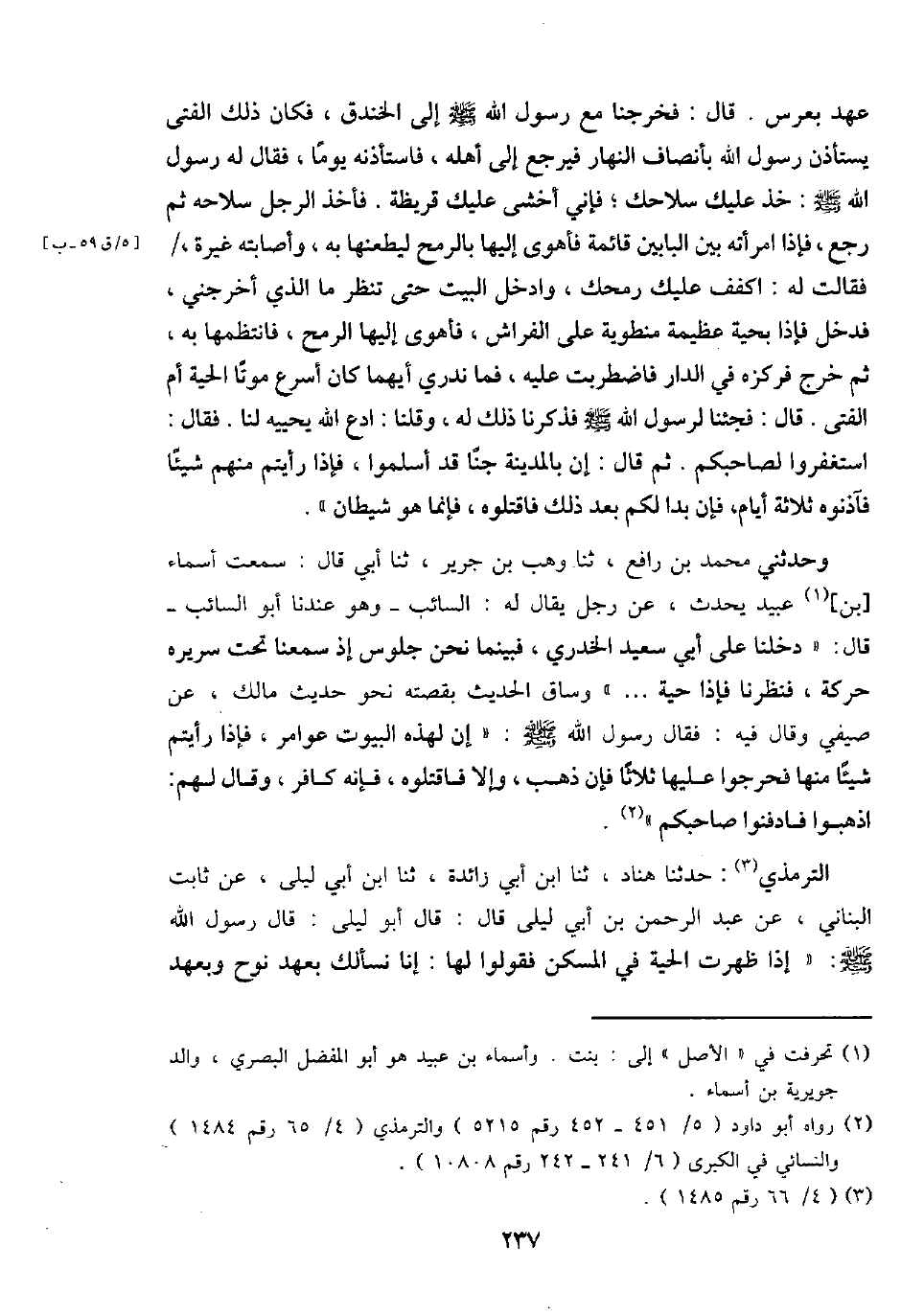 عهد بعرس. قَالَ: فخرجنا مَعَ رَسُول الله - صَلَّى اللَّهُ عَلَيْهِ وَسَلَّم َ - إِلَى الخَنْدَق، فَكَانَ ذَلِك الْفَتى يسْتَأْذن رَسُول الله بأنصاف النَّهَار فَيرجع إِلَى أَهله، فاستأذنه يَوْمًا، فَقَالَ لَهُ رَسُول الله - صَلَّى اللَّهُ عَلَيْهِ وَسَلَّم َ -: خُذ عَلَيْك سِلَاحك؛ فَإِنِّي أخْشَى عَلَيْك قُرَيْظَة. فَأخذ الرجل سلاحه ثمَّ رَجَعَ، فَإِذا امْرَأَته بَين الْبَابَيْنِ قَائِمَة فَأَهوى إِلَيْهَا بِالرُّمْحِ ليطعنها بِهِ، وأصابته غيرَة، فَقَالَت لَهُ: اكفف عَلَيْك رمحك، وادخل الْبَيْت حَتَّى تنظر مَا الَّذِي أخرجني، فَدخل فَإِذا بحية عَظِيمَة منطوية على الْفراش، فأهوي إِلَيْهَا الرمْح، فانتظمها بِهِ، ثمَّ خرج فركزه فِي الدَّار فاضطربت عَلَيْهِ، فَمَا نَدْرِي أَيهمَا كَانَ أسْرع موتا الْحَيَّة أم الْفَتى. قَالَ: فَجِئْنَا لرَسُول الله - صَلَّى اللَّهُ عَلَيْهِ وَسَلَّم َ - فَذَكرنَا ذَلِك لَهُ، وَقُلْنَا: ادْع الله يحييه لنا. فَقَالَ: اسْتَغْفرُوا لصاحبكم. ثمَّ قَالَ: إِن بِالْمَدِينَةِ جناً قد أَسْلمُوا، فَإِذا رَأَيْتُمْ مِنْهُم شَيْئا فآذنوه ثَلَاثَة أَيَّام، فَإِن بدا لكم بعد ذَلِك فَاقْتُلُوهُ، فَإِنَّمَا هُوَ شَيْطَان ".