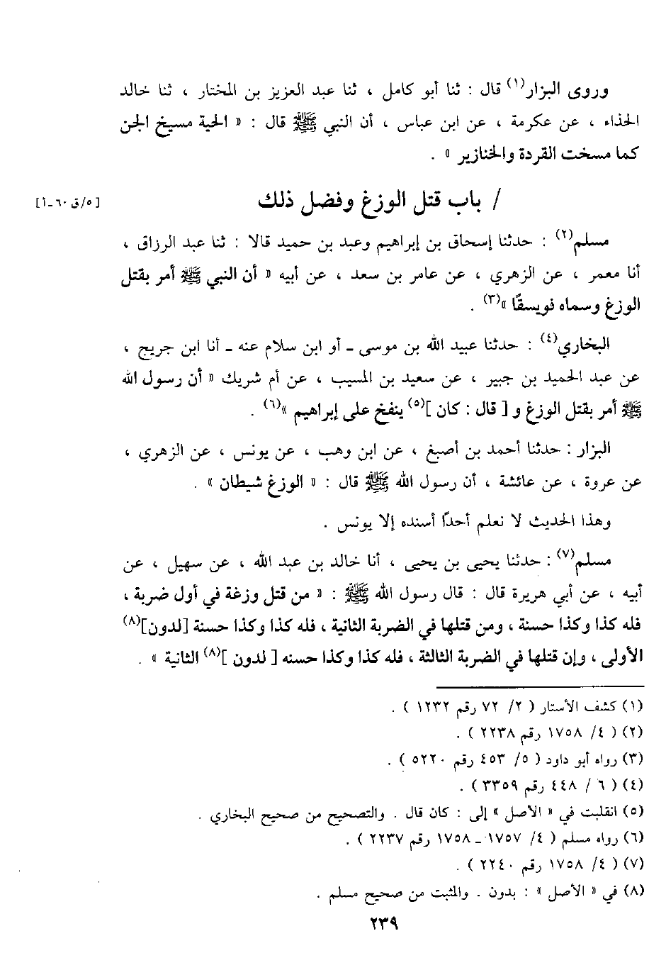 مُسلم: حَدثنَا يحيى بن يحيى، أَنا خَالِد بن عبد الله، عَن سُهَيْل، عَن أَبِيه، عَن أبي هُرَيْرَة قَالَ: قَالَ رَسُول الله - صَلَّى اللَّهُ عَلَيْهِ وَسَلَّم َ -: " من قتل وزغة فِي أول ضَرْبَة، فَلهُ كَذَا وَكَذَا حَسَنَة، وَمن قَتلهَا فِي الضَّرْبَة الثَّانِيَة، فَلهُ كَذَا وَكَذَا حَسَنَة [لدوّنَ] الأولى، وَإِن قَتلهَا فِي الضَّرْبَة الثَّالِثَة، فَلهُ كَذَا وَكَذَا حسنه [لدوّنَ] الثَّانِيَة ".