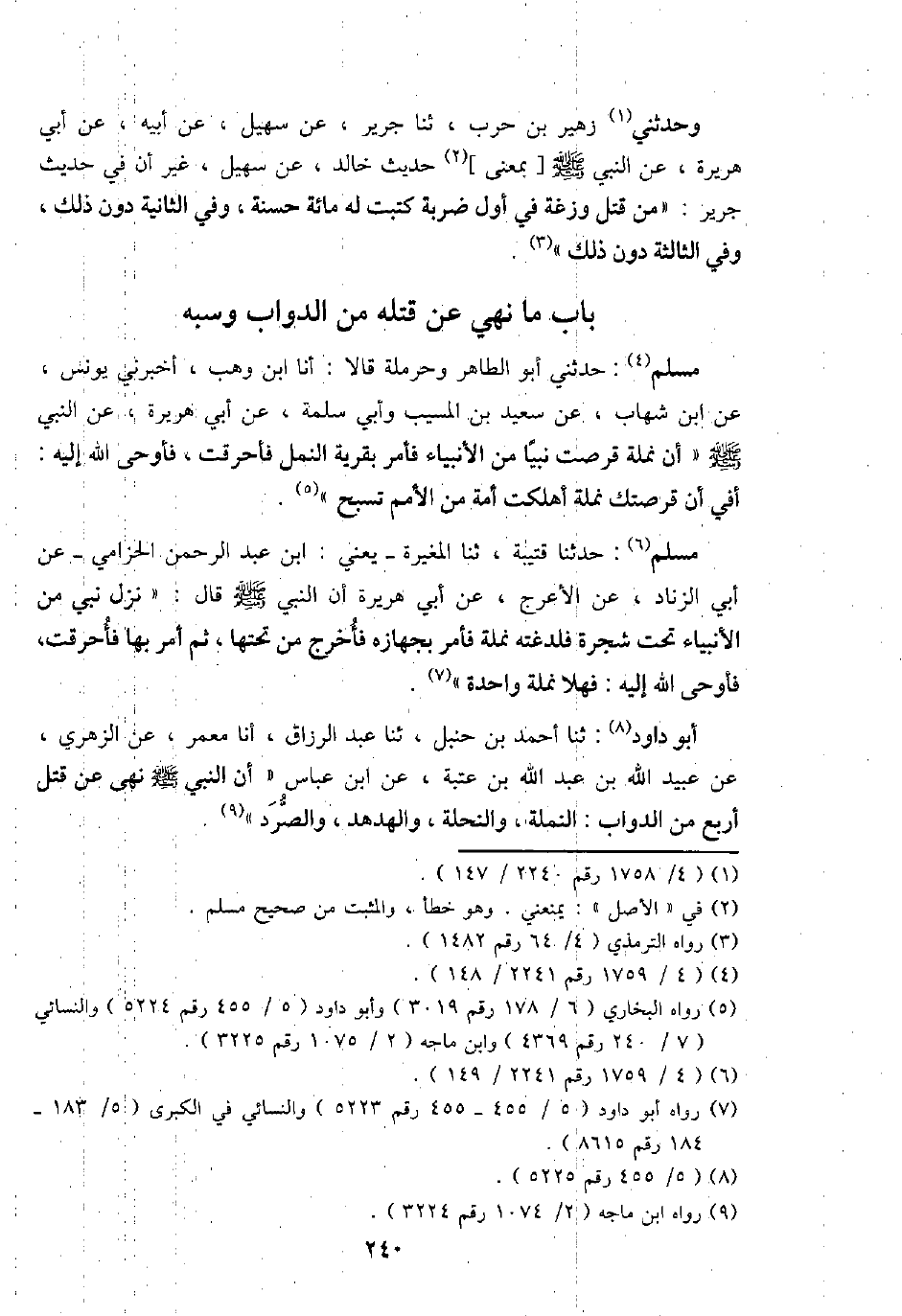 مُسلم: حَدثنِي أَبُو الطَّاهِر وحرملة قَالَا: أَنا ابْن وهب، أَخْبرنِي يُونُس، عَن ابْن شهَاب، عَن سعيد بن الْمسيب وَأبي سَلمَة، عَن أبي هُرَيْرَة، عَن النَّبِي - صَلَّى اللَّهُ عَلَيْهِ وَسَلَّم َ - " أَن نملة قرصت نَبيا من الْأَنْبِيَاء فَأمر بقرية النَّمْل فأحرقت، فَأوحى الله إِلَيْهِ: أَفِي أَن قرصتك نملة أهلكت أمة من الْأُمَم تسبح ".