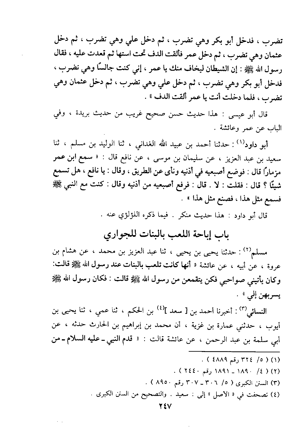مُسلم: حَدثنَا يحيى بن يحيى، ثَنَا عبد الْعَزِيز بن مُحَمَّد، عَن هِشَام بن عُرْوَة، عَن أَبِيه، عَن عَائِشَة " أَنَّهَا كَانَت تلعب بالبنات عِنْد رَسُول الله - صَلَّى اللَّهُ عَلَيْهِ وَسَلَّم َ - قَالَت: وَكَانَ يأتيني صواحبي فَكُن يتقمعن من رَسُول الله - صَلَّى اللَّهُ عَلَيْهِ وَسَلَّم َ - قَالَت: فَكَانَ رَسُول الله - صَلَّى اللَّهُ عَلَيْهِ وَسَلَّم َ - يسربهن إِلَيّ ".