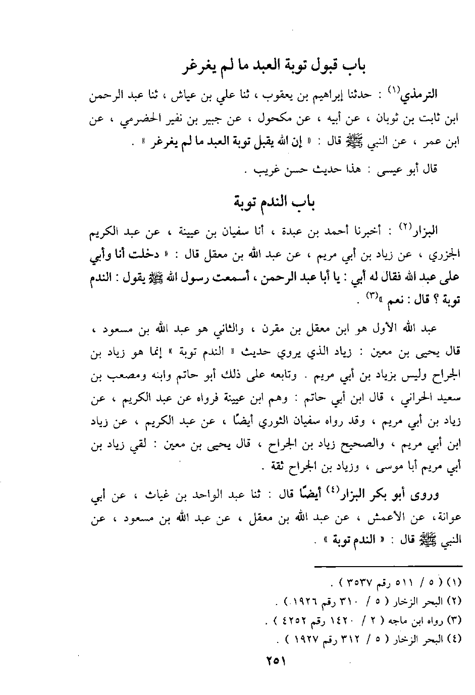 الْبَزَّار: أخبرنَا أَحْمد بن عَبدة، أَنا سُفْيَان بن عُيَيْنَة، عَن عبد الْكَرِيم الْجَزرِي، عَن زِيَاد بن أبي مَرْيَم، عَن عبد الله بن معقل قَالَ: " دخلت أَنا وَأبي على عبد الله فَقَالَ لي أبي: يَا أَبَا عبد الرَّحْمَن، أسمعت رَسُول الله - صَلَّى اللَّهُ عَلَيْهِ وَسَلَّم َ - يَقُول: النَّدَم تَوْبَة؟ قَالَ: نعم ".