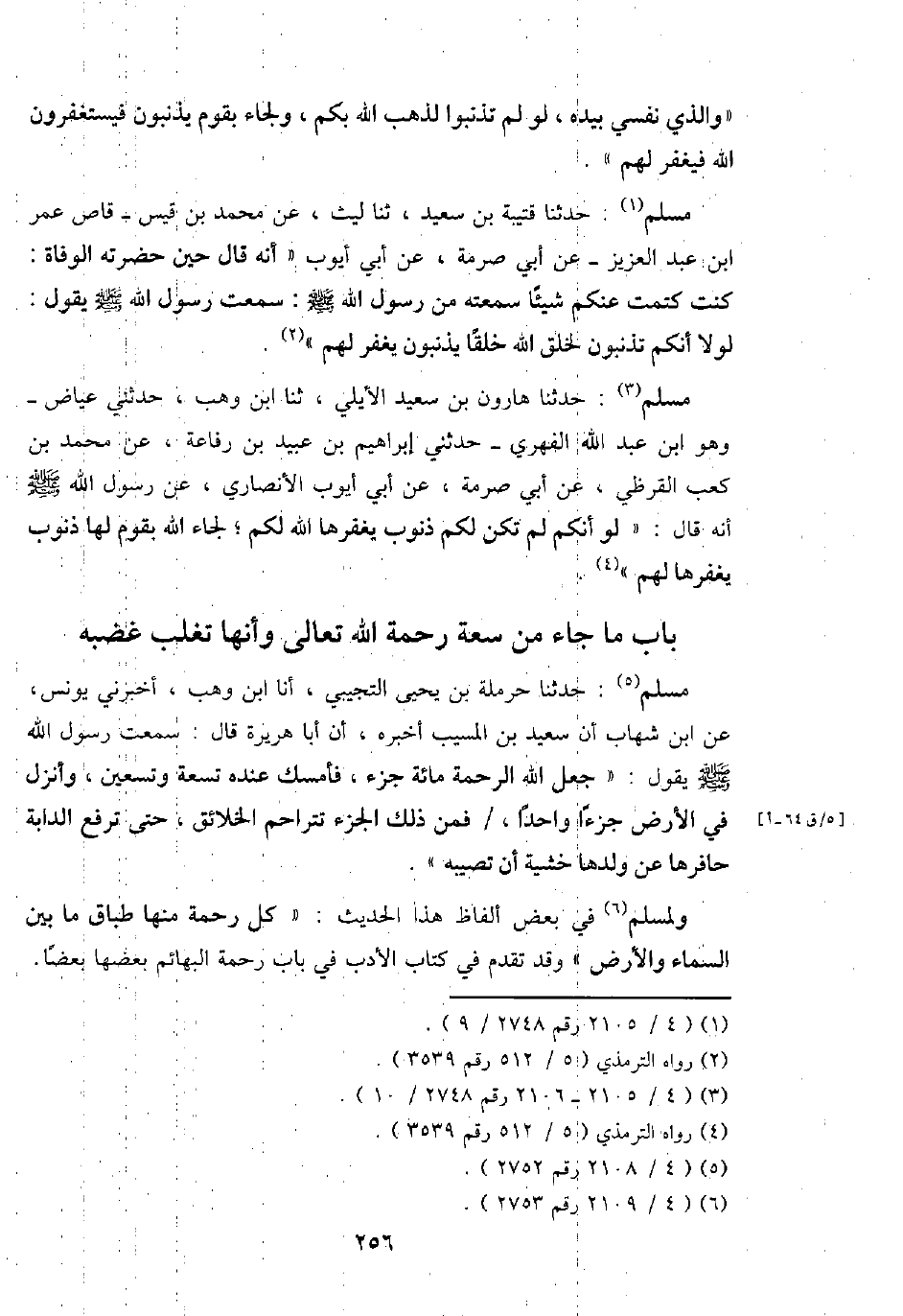 مُسلم: حَدثنَا هَارُون بن سعيد الْأَيْلِي، ثَنَا ابْن وهب، حَدثنِي عِيَاض - وَهُوَ ابْن عبد الله الفِهري - حَدثنِي إِبْرَاهِيم بن عبيد بن رِفَاعَة، عَن مُحَمَّد بن كَعْب الْقرظِيّ، عَن أبي صرمة، عَن أبي أَيُّوب الْأنْصَارِيّ، عَن رَسُول الله - صَلَّى اللَّهُ عَلَيْهِ وَسَلَّم َ - أَنه قَالَ: " لَو أَنكُمْ لم تكن لكم ذنُوب يغفرها الله لكم؛ لجاء الله بِقوم لَهَا ذنُوب يغفرها لَهُم ".