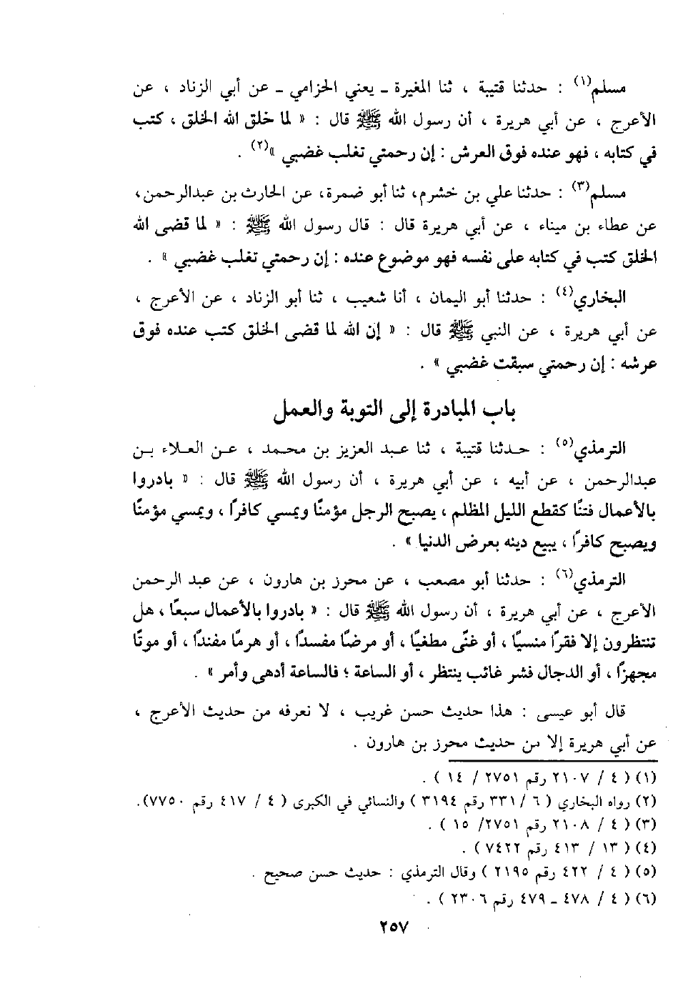مُسلم: حَدثنَا قُتَيْبَة، ثَنَا الْمُغيرَة - يَعْنِي الْحزَامِي - عَن أبي الزِّنَاد، عَن الْأَعْرَج، عَن أبي هُرَيْرَة، أَن رَسُول الله - صَلَّى اللَّهُ عَلَيْهِ وَسَلَّم َ - قَالَ: " لما خلق الله الْخلق، كتب فِي كِتَابه، فَهُوَ عِنْده فَوق الْعَرْش: إِن رَحْمَتي تغلب غَضَبي ".