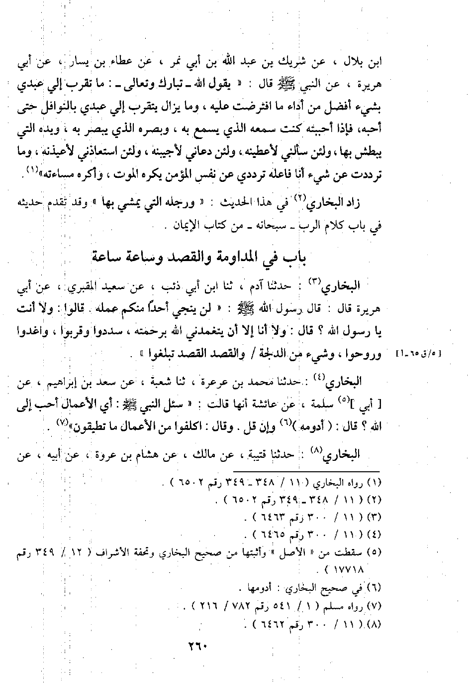 البُخَارِيّ: حَدثنَا مُحَمَّد بن عرْعرة، ثَنَا شُعْبَة، عَن سعد بن إِبْرَاهِيم، عَن [أبي] سَلمَة، عَن عَائِشَة أَنَّهَا قَالَت: " سُئِلَ النَّبِي - صَلَّى اللَّهُ عَلَيْهِ وَسَلَّم َ -: أَي الْأَعْمَال أحب إِلَى الله؟ قَالَ: (أَدْوَمه) وَإِن قل. وَقَالَ: اكلفوا من الْأَعْمَال مَا تطيقون ".