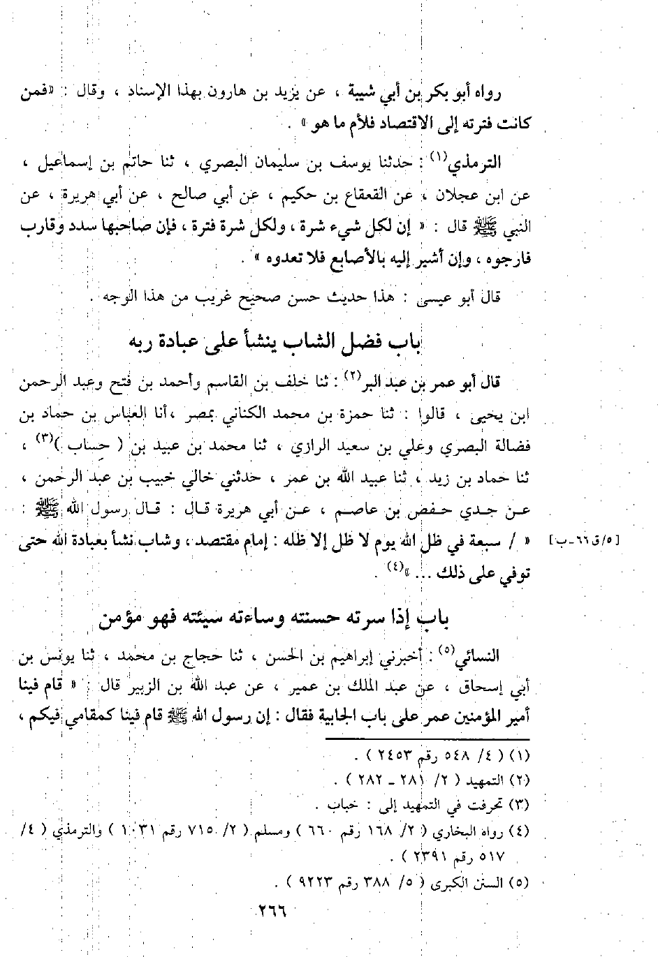 قَالَ أَبُو عمر بن عبد الْبر: ثَنَا خلف بن الْقَاسِم وَأحمد بن فتح وَعبد الرَّحْمَن ابْن يحيى، قَالُوا: ثَنَا حَمْزَة بن مُحَمَّد الْكِنَانِي بِمصْر، أَنا الْعَبَّاس بن حَمَّاد بن فضَالة الْبَصْرِيّ وَعلي بن سعيد الرَّازِيّ، ثَنَا مُحَمَّد بن عبيد بن (حِسَاب) ، عَن جدي حَفْص بن عَاصِم، عَن أبي هُرَيْرَة قَالَ: قَالَ رَسُول الله - صَلَّى اللَّهُ عَلَيْهِ وَسَلَّم َ -: " سَبْعَة فِي ظلّ الله يَوْم لَا ظلّ إِلَّا ظله: إِمَام مقتصد، وشاب نَشأ بِعبَادة الله حَتَّى توفّي على ذَلِك ... . ".