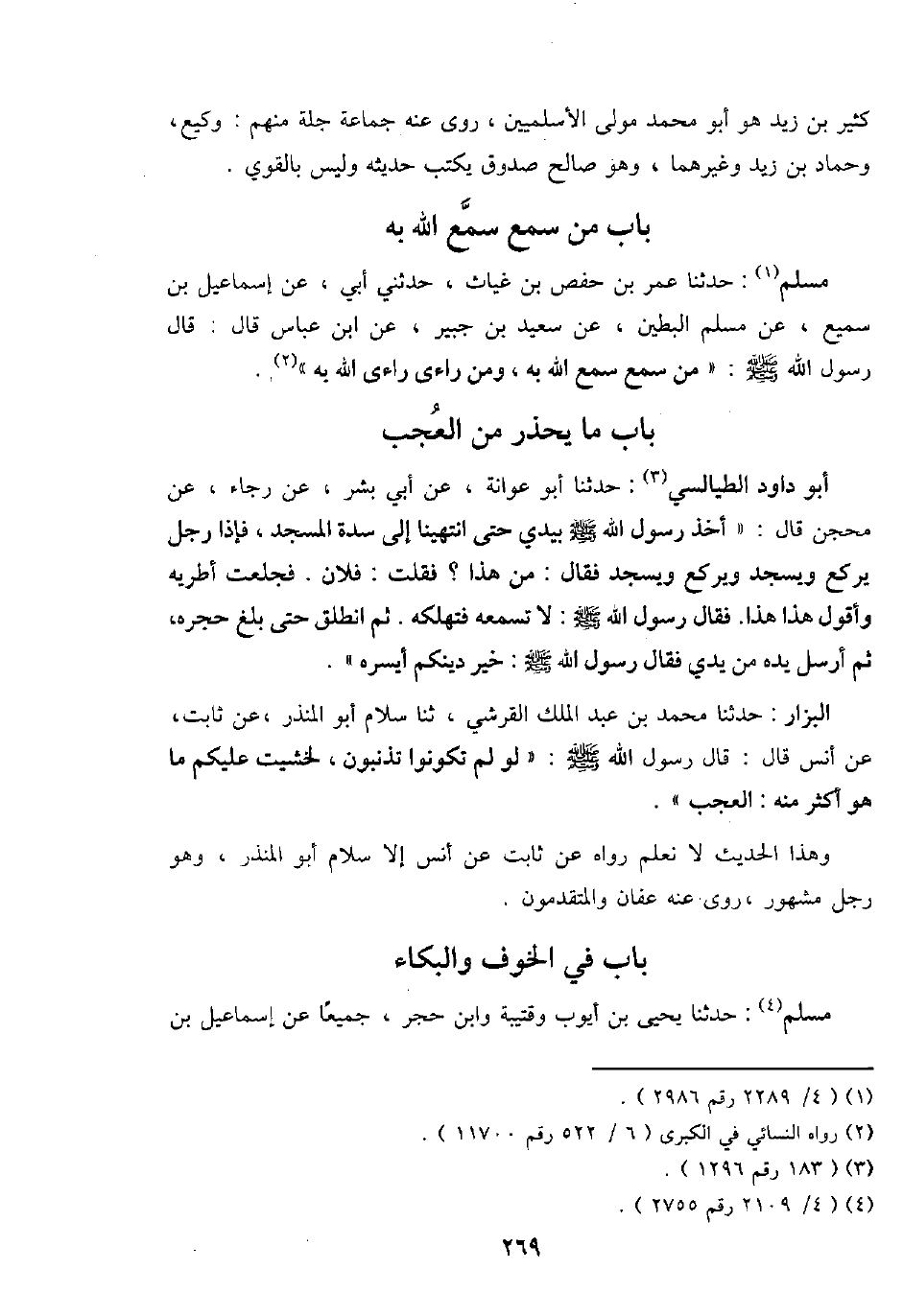 مُسلم: حَدثنَا عمر بن حَفْص بن غياث، حَدثنِي أبي، عَن إِسْمَاعِيل بن سميع، عَن مُسلم البطين، عَن سعيد بن جُبَير، عَن ابْن عَبَّاس قَالَ: قَالَ رَسُول الله - صَلَّى اللَّهُ عَلَيْهِ وَسَلَّم َ -: " من سمع سمع الله بِهِ، وَمن راءى راءى الله بِهِ ".