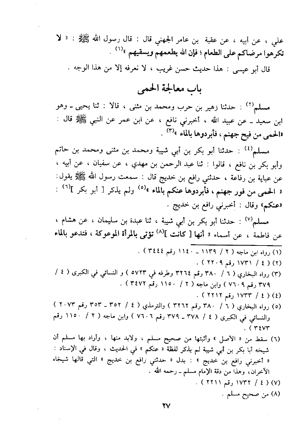 مُسلم: حَدثنَا أَبُو بكر بن أبي شيبَة وَمُحَمّد بن مثنى وَمُحَمّد بن حَاتِم وَأَبُو بكر بن نَافِع، قَالُوا: ثَنَا عبد الرَّحْمَن بن مهْدي، عَن سُفْيَان، عَن أَبِيه، عَن عَبَايَة بن رِفَاعَة، حَدثنِي رَافع بن خديج قَالَ: سَمِعت رَسُول الله - صَلَّى اللَّهُ عَلَيْهِ وَسَلَّم َ - يَقُول: " الْحمى من فَور جَهَنَّم، فَأَبْرِدُوهَا عَنْكُم بِالْمَاءِ " وَلم يذكر [أَبُو بكر] : " عَنْكُم " وَقَالَ: أَخْبرنِي رَافع بن خديج.