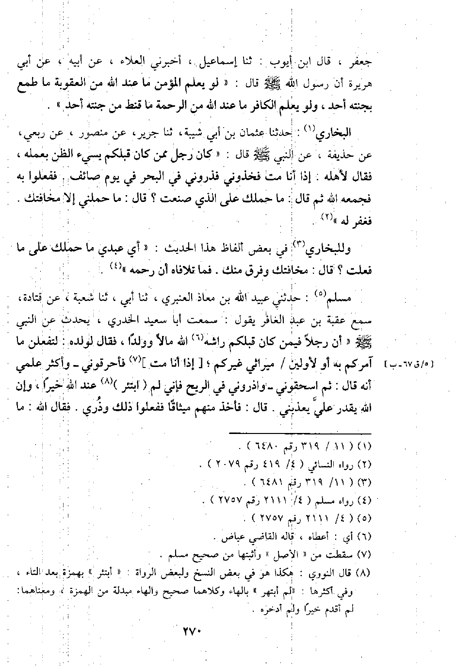البُخَارِيّ: حَدثنَا عُثْمَان بن أبي شيبَة، ثَنَا جرير، عَن مَنْصُور، عَن ربعي، عَن حُذَيْفَة، عَن النَّبِي - صَلَّى اللَّهُ عَلَيْهِ وَسَلَّم َ - قَالَ: " كَانَ رجل مِمَّن كَانَ قبلكُمْ يسيء الظَّن بِعَمَلِهِ، فَقَالَ لأَهله: إِذا أَنا مت فخذوني فذروني فِي الْبَحْر فِي يَوْم صَائِف. فَفَعَلُوا بِهِ فَجَمعه الله ثمَّ قَالَ: مَا حملك على الَّذِي صنعت؟ قَالَ: مَا حَملَنِي إِلَّا مخافتك. فغفر لَهُ ".