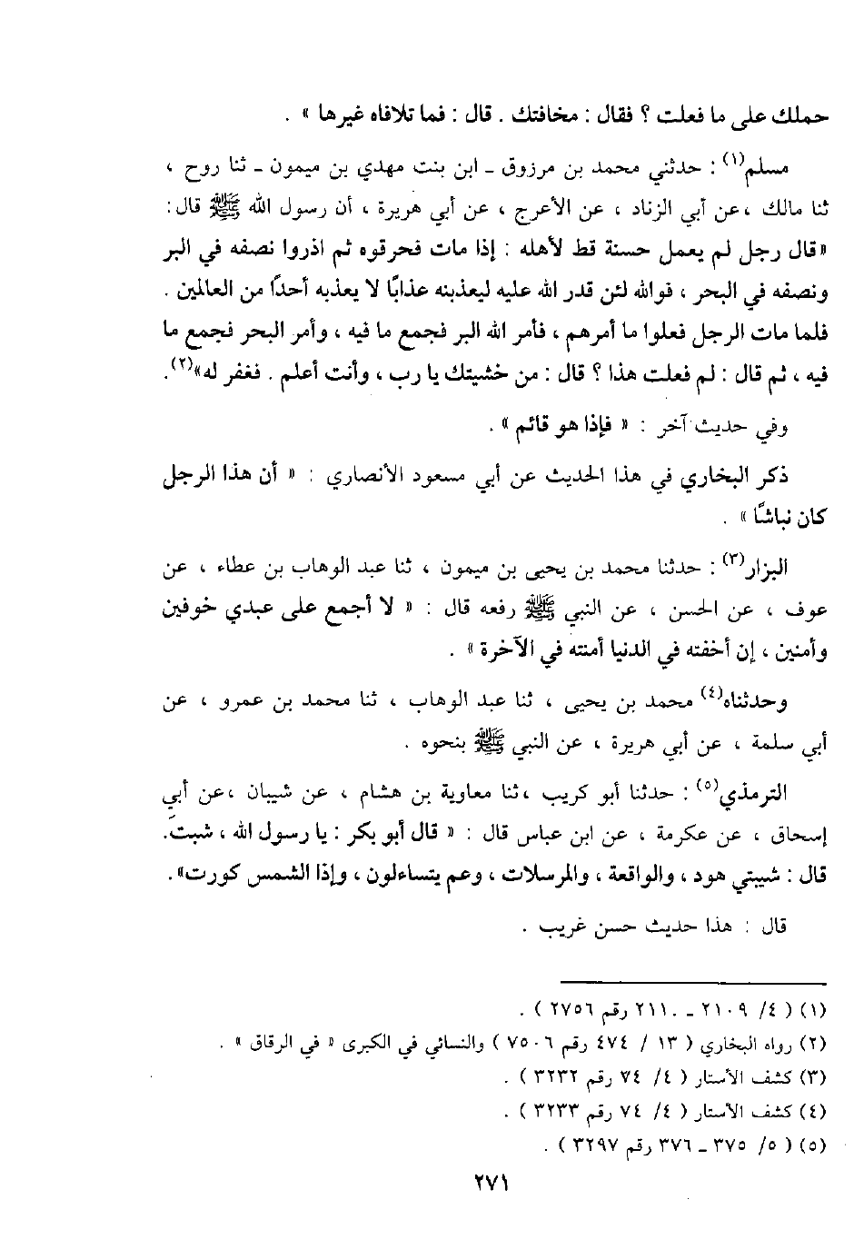مُسلم: حَدثنِي مُحَمَّد بن مَرْزُوق - ابْن بنت مهْدي بن مَيْمُون - ثَنَا روح، ثَنَا مَالك، عَن أبي الزِّنَاد، عَن الْأَعْرَج، عَن أبي هُرَيْرَة، أَن رَسُول الله - صَلَّى اللَّهُ عَلَيْهِ وَسَلَّم َ - قَالَ: " قَالَ رجل لم يعْمل حَسَنَة قطّ لأَهله: إِذا مَاتَ فحرقوه ثمَّ اذروا نصفه فِي الْبر وَنصفه فِي الْبَحْر، فوَاللَّه لَئِن قدر الله عَلَيْهِ ليعذبنه عذَابا لَا يعذبه أحدا من الْعَالمين. فَلَمَّا مَاتَ الرجل فعلوا مَا أَمرهم، فَأمر الله الْبر فَجمع مَا فِيهِ، وَأمر الْبَحْر فَجمع مَا فِيهِ، ثمَّ قَالَ: لم فعلت هَذَا؟ قَالَ: من خشيتك يَا رب، وَأَنت أعلم. فغفر لَهُ ".