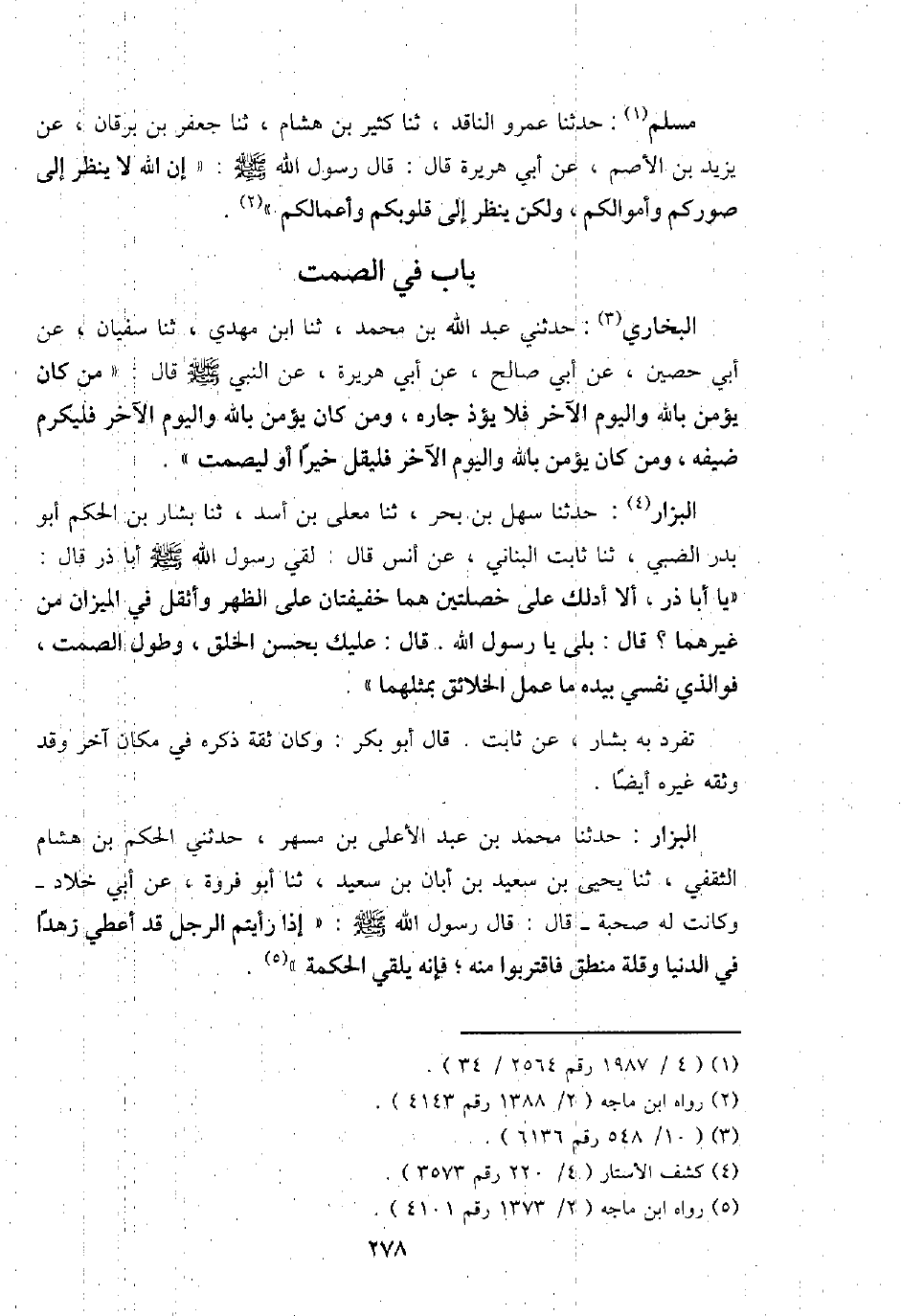 البُخَارِيّ: حَدثنِي عبد الله بن مُحَمَّد، ثَنَا ابْن مهْدي، ثَنَا سُفْيَان، عَن أبي حُصَيْن، عَن أبي صَالح، عَن أبي هُرَيْرَة، عَن النَّبِي - صَلَّى اللَّهُ عَلَيْهِ وَسَلَّم َ - قَالَ: " من كَانَ يُؤمن بِاللَّه وَالْيَوْم الآخر فَلَا يؤذ جَاره، وَمن كَانَ يُؤمن بِاللَّه وَالْيَوْم الآخر فَليُكرم ضَيفه، وَمن كَانَ يُؤمن بِاللَّه وَالْيَوْم الآخر فَلْيقل خيرا أَو ليصمت ".