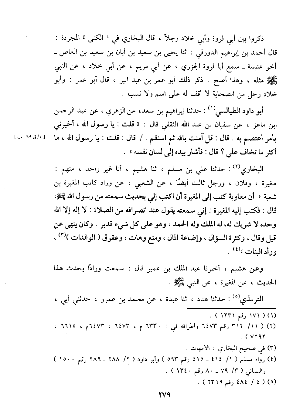 البُخَارِيّ: حَدثنَا عَليّ بن مُسلم، ثَنَا هشيم، أَنا غير وَاحِد، مِنْهُم: مُغيرَة، وَفُلَان، وَرجل ثَالِث أَيْضا، عَن الشّعبِيّ، عَن وراد كَاتب الْمُغيرَة بن شُعْبَة " أَن مُعَاوِيَة كتب إِلَى الْمُغيرَة أَن اكْتُبْ إِلَيّ بِحَدِيث سمعته من رَسُول الله - صَلَّى اللَّهُ عَلَيْهِ وَسَلَّم َ -، قَالَ: فَكتب إِلَيْهِ الْمُغيرَة: إِنِّي سمعته يَقُول عِنْد انْصِرَافه من الصَّلَاة: لَا إِلَه إِلَّا الله وَحده لَا شريك لَهُ، لَهُ الْملك وَله الْحَمد، وَهُوَ على كل شَيْء قدير. وَكَانَ ينْهَى عَن قيل وَقَالَ، وَكَثْرَة السُّؤَال، وإضاعة المَال، وَمنع وهات، وعقوق (الوالدات) ، ووأد الْبَنَات ".