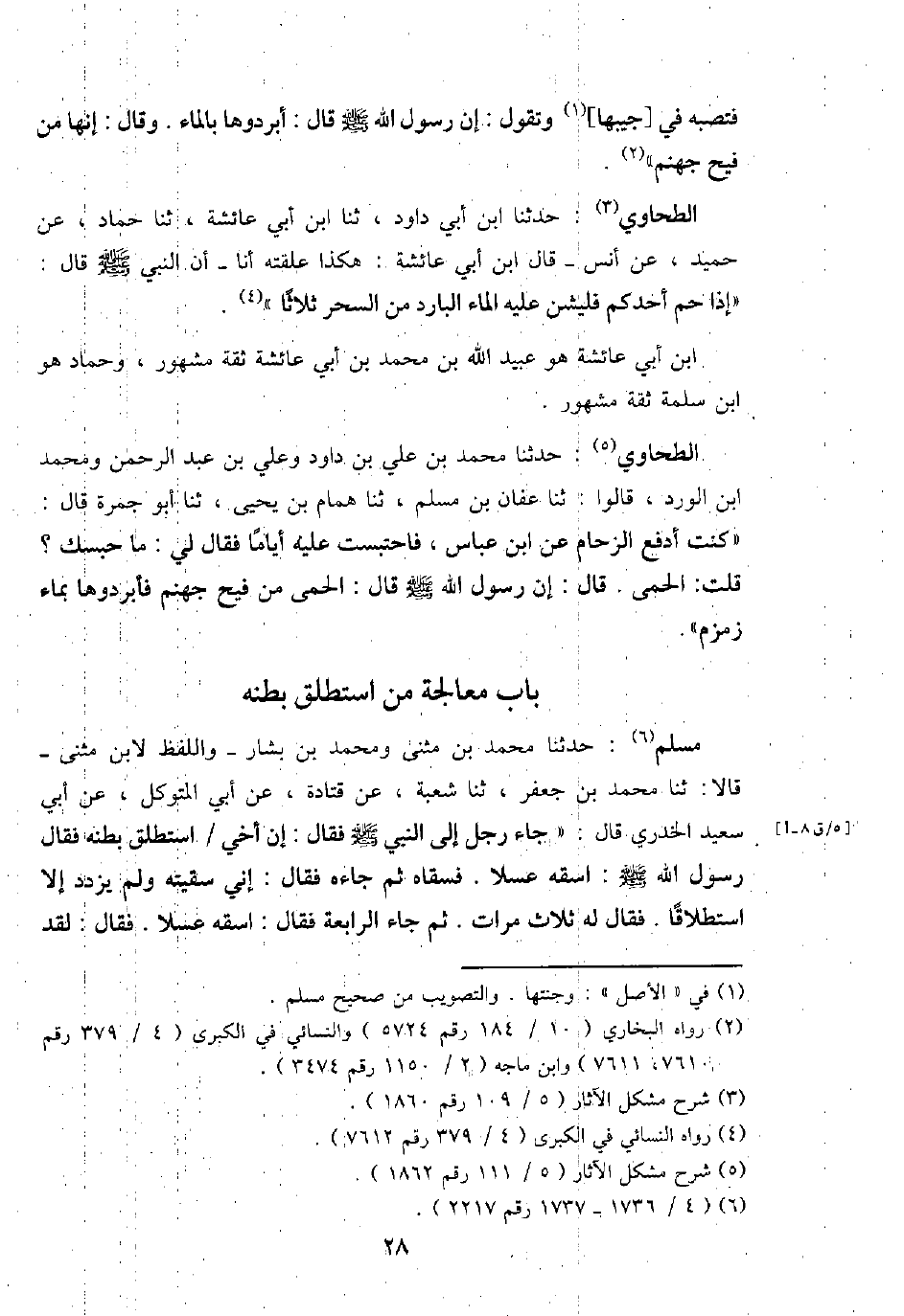 الطَّحَاوِيّ: حَدثنَا ابْن أبي دَاوُد، ثَنَا ابْن أبي عَائِشَة، ثَنَا حَمَّاد، عَن حميد، عَن أنس - قَالَ ابْن أبي عَائِشَة: هَكَذَا علقته أَنا - أَن النَّبِي - صَلَّى اللَّهُ عَلَيْهِ وَسَلَّم َ - قَالَ: " إِذا حم أحدكُم فليشن عَلَيْهِ المَاء الْبَارِد من السحر ثَلَاثًا ".